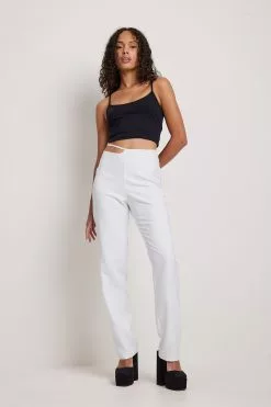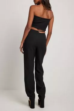 These trousers feature a cut out detail at the waist with an embellished buckle. They have a zipper on the side and gently tapered legs. Inseam length in size 36: 80 cm / 31.49 in.