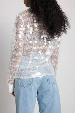 This shirt is seethrough and features long sleeves, a button closure, a lace design and a transparent sequin detail along the item.