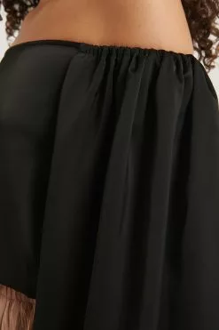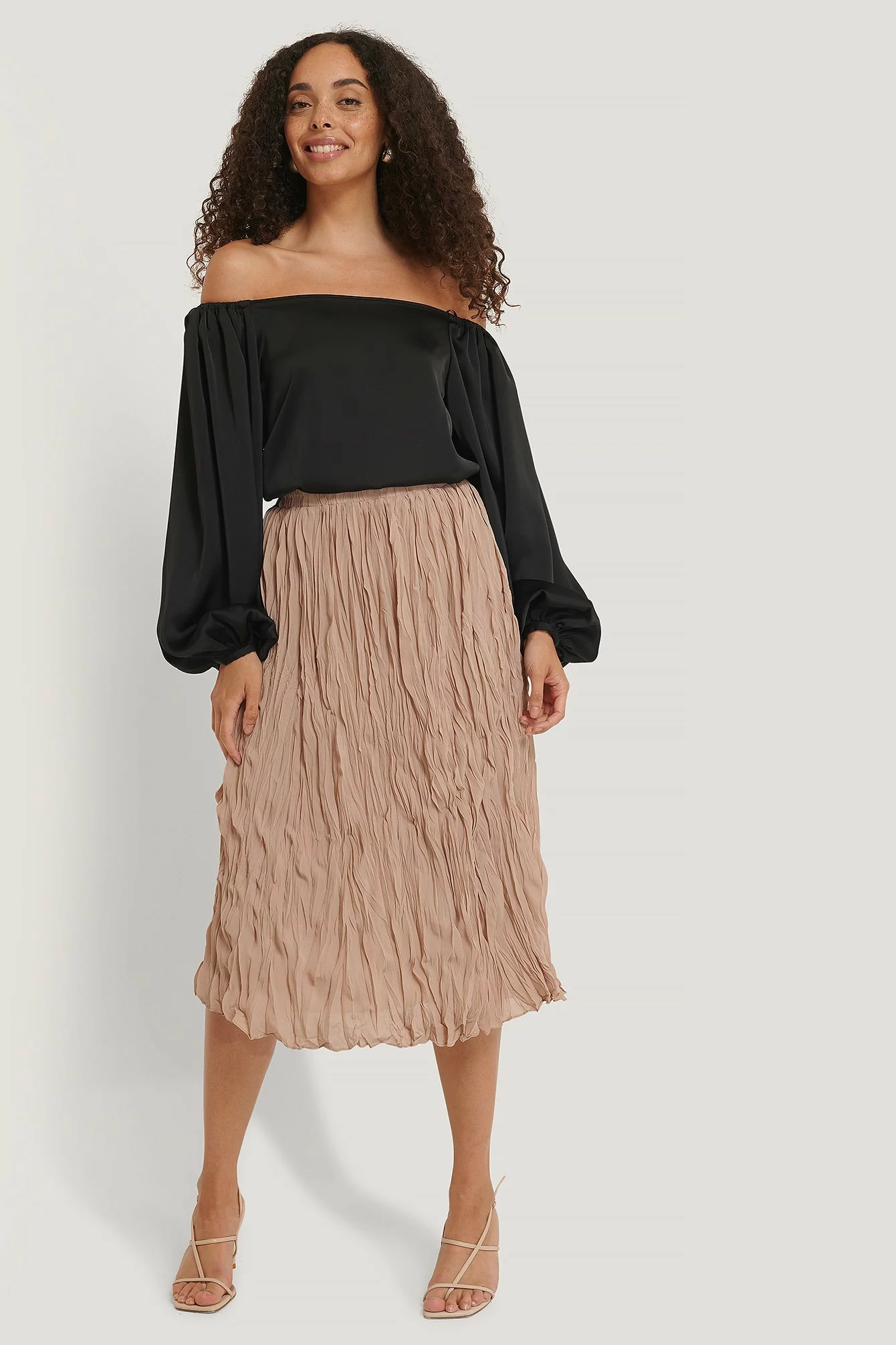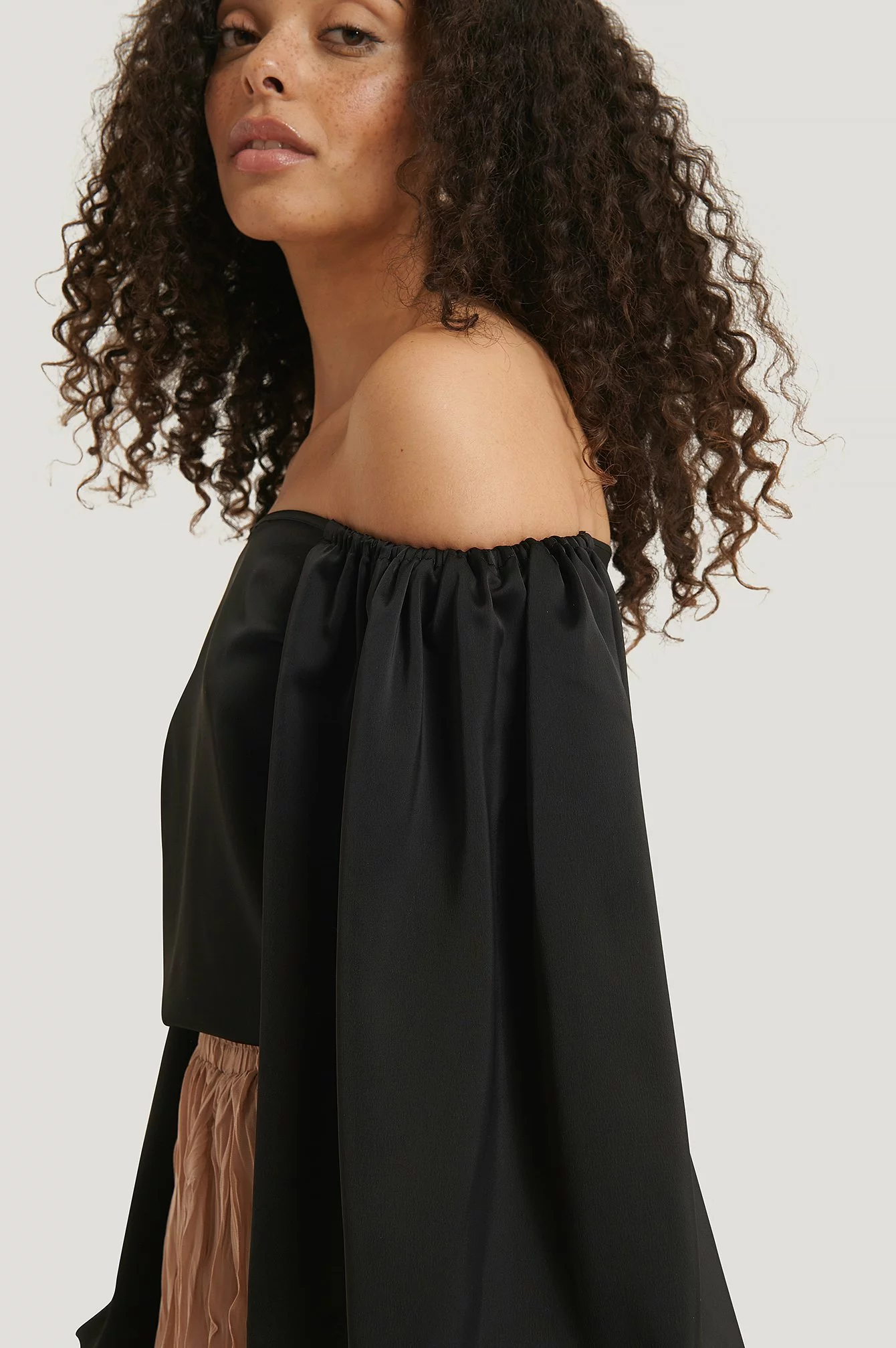 This blouse features an off shoulder design, long balloon sleeves with button closures at the cuffs, cropped length and a satin feel.