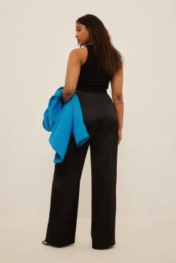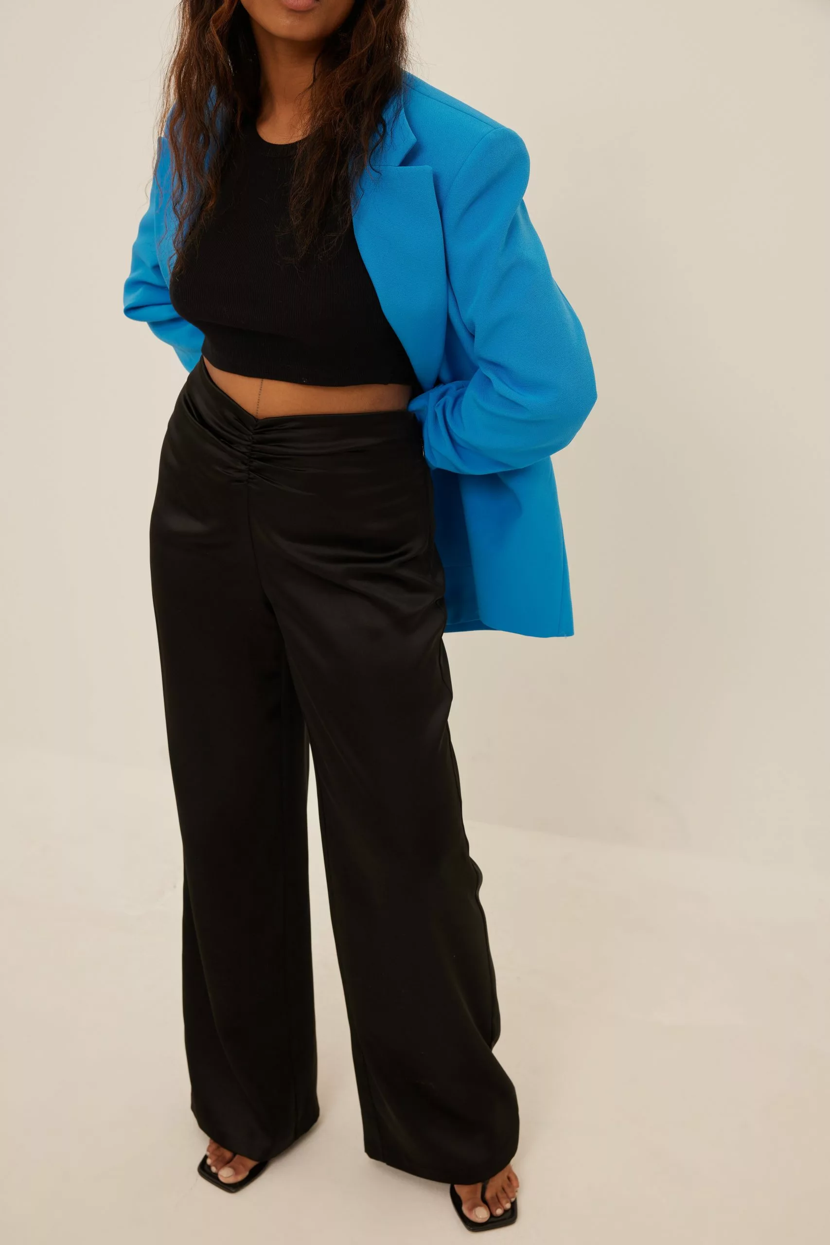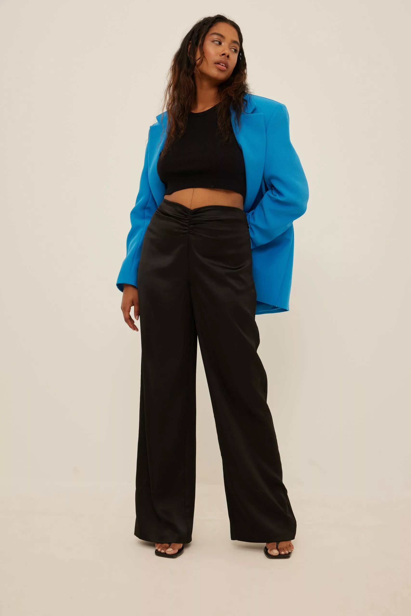 These trousers feature a high waist with ruching along the front, a side zipper, wide legs and a flowy, satin material.
