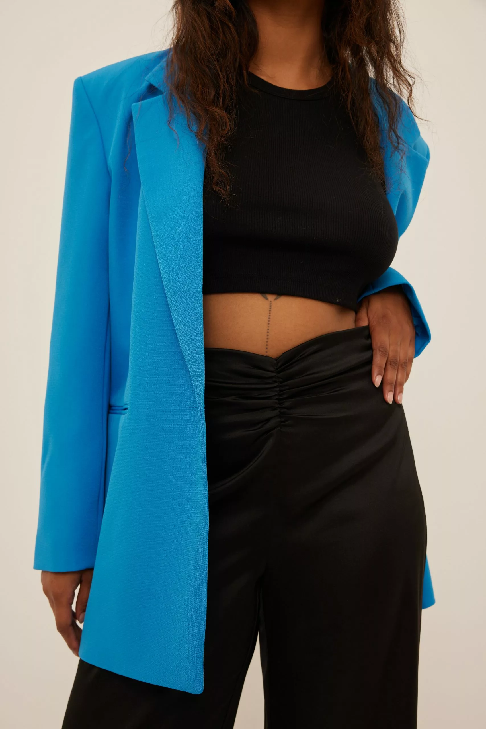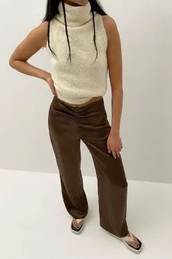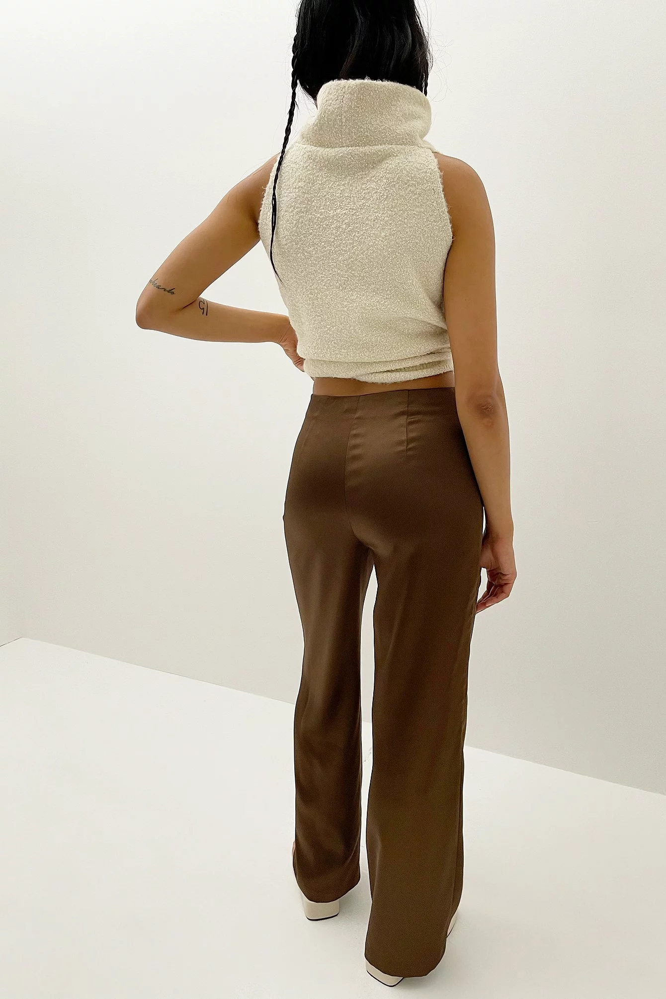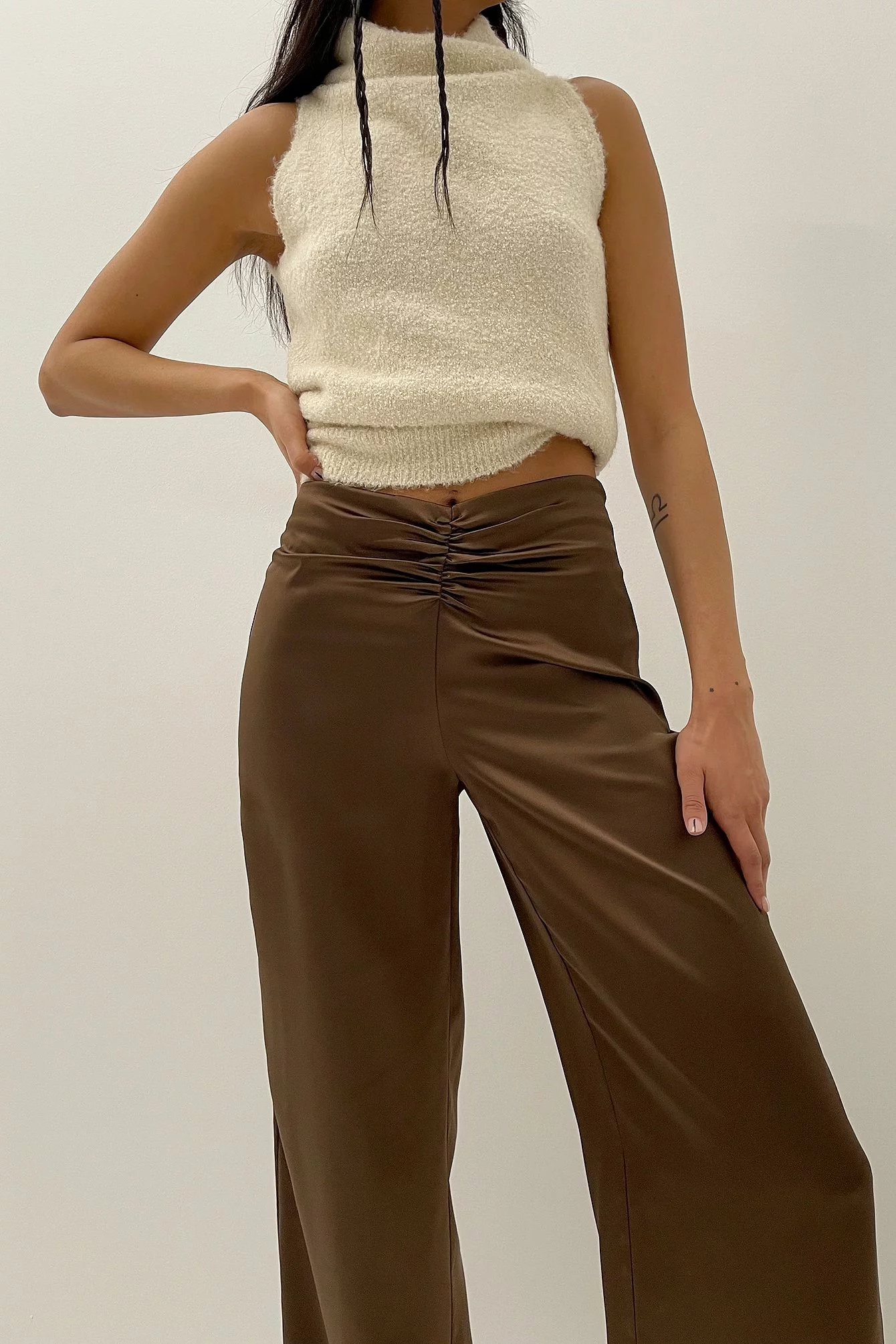 These trousers feature a high waist with ruching along the front, a side zipper, wide legs and a flowy, satin material.
