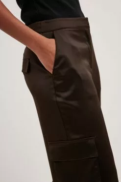 These cargo pants feature a satin touch. They have a mid waist and a wide leg. These cargo pants feature a zip and hook closure, two side pockets and two back mock pockets. Inseam length in size 36: 80 cm / 31.49 in.