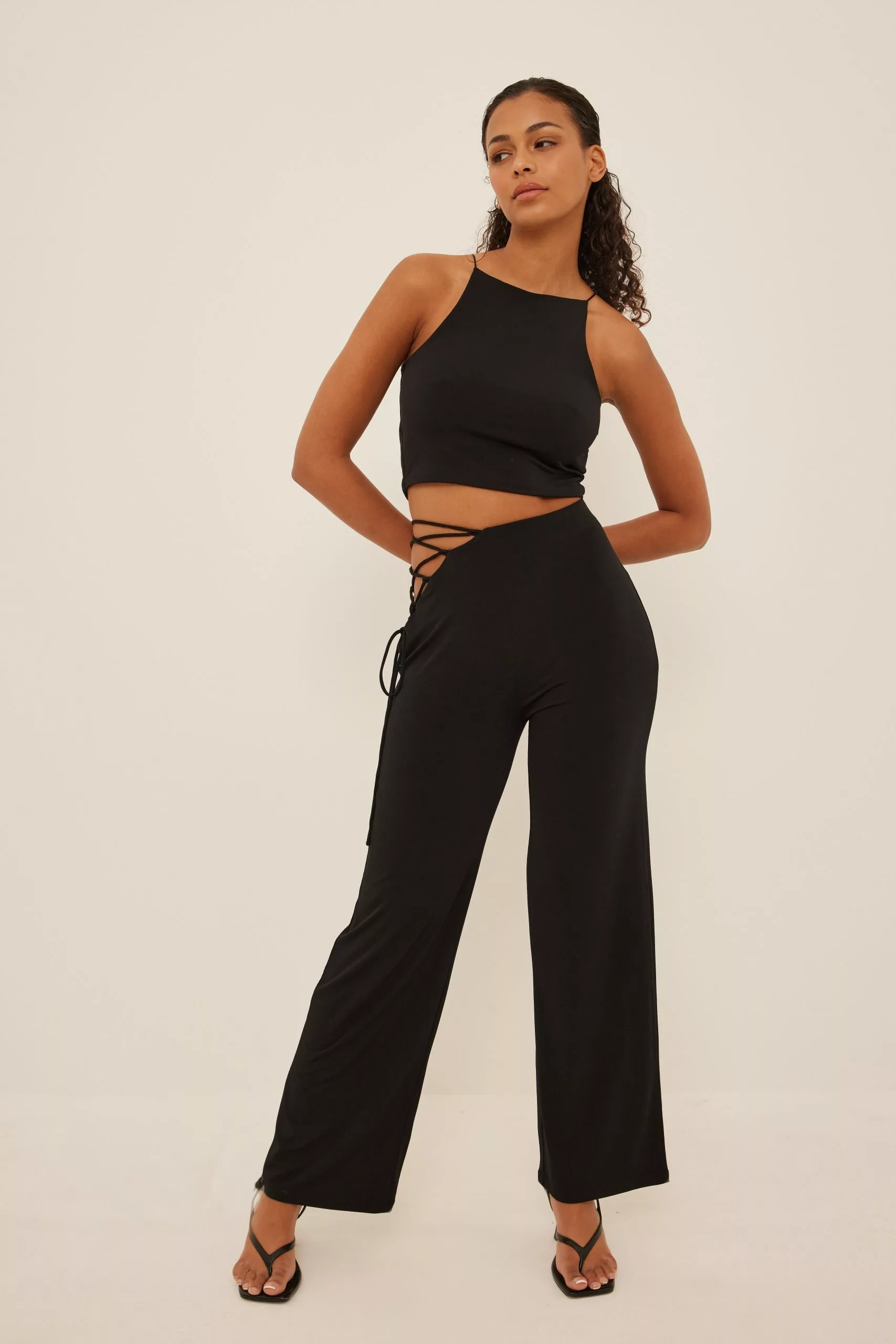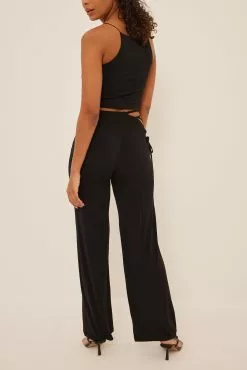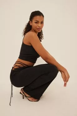 These trousers feature a high waist with an elasticized waistband and a lacing detail on the hip, wide legs and a stretchy material in jersey.