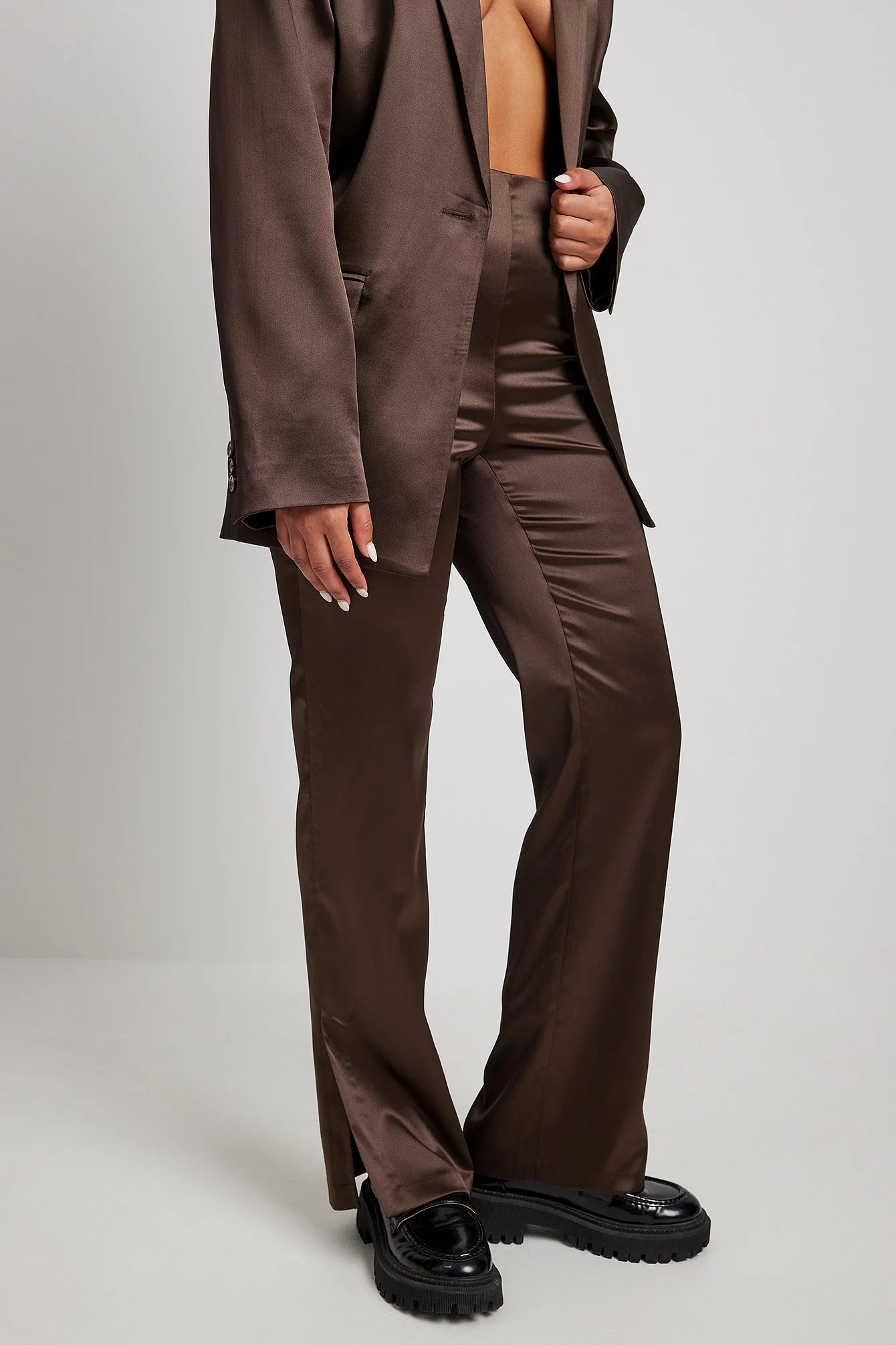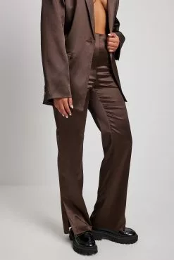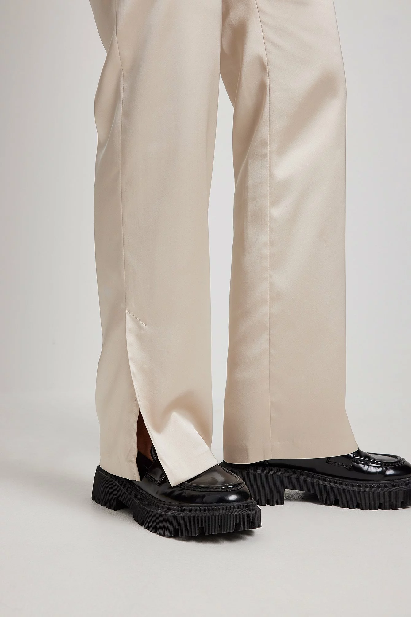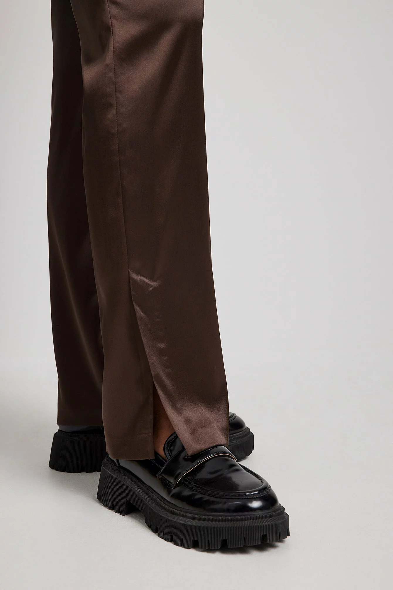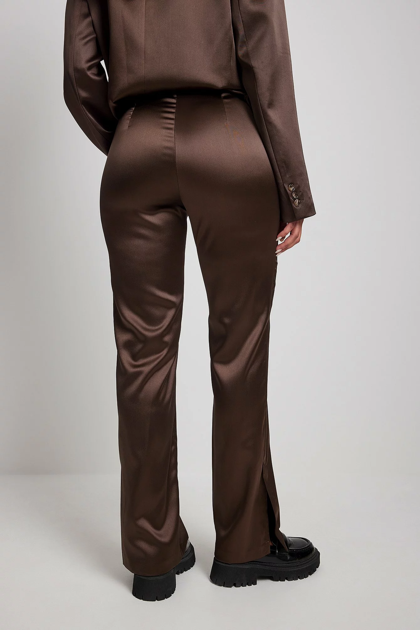 These pants are made of satin and feature a straight leg. They have a side pocket and a side slit. Inseam length in size 36: 80 cm / 31.49 in.
