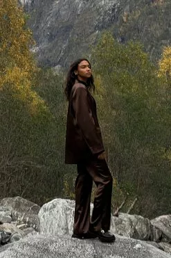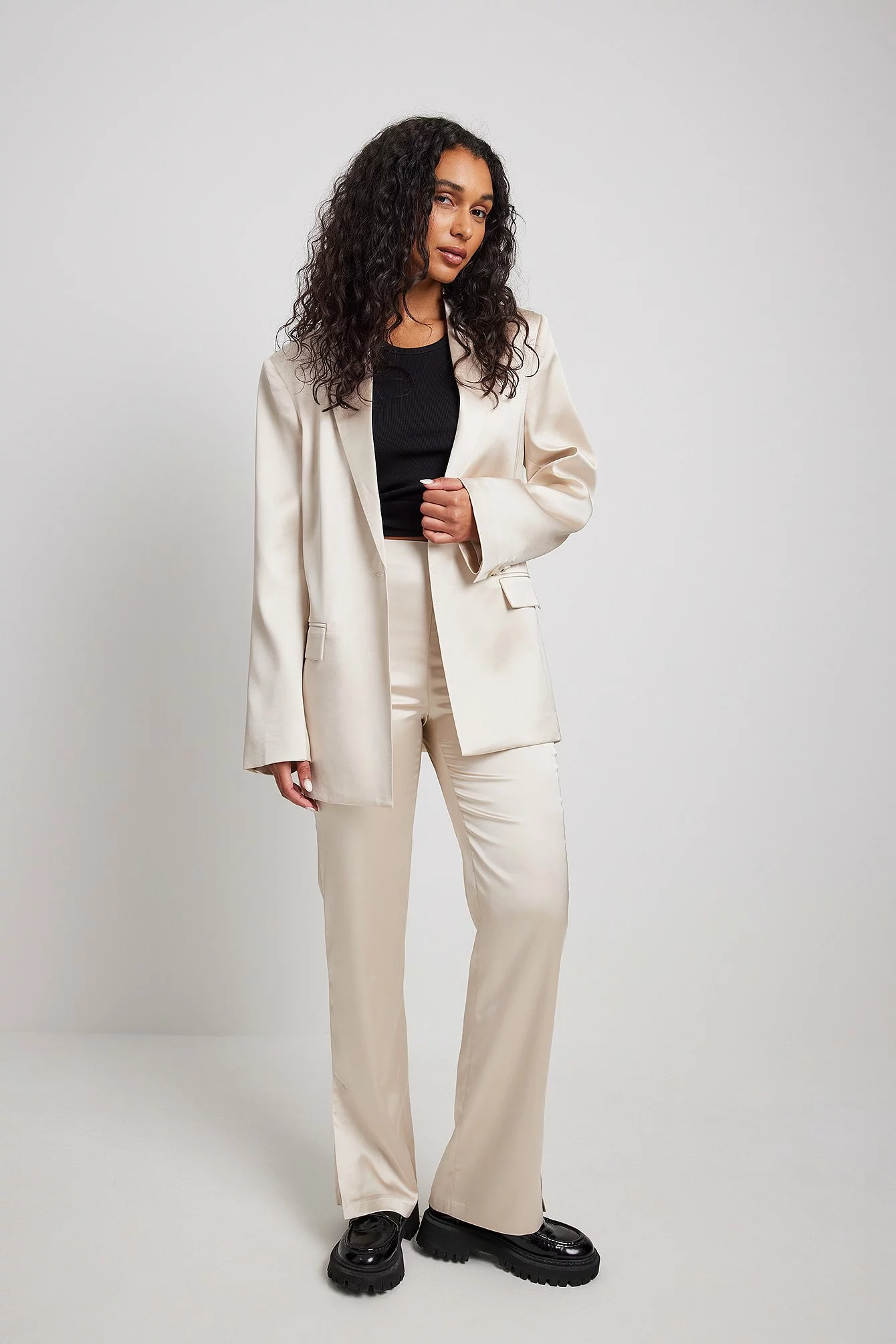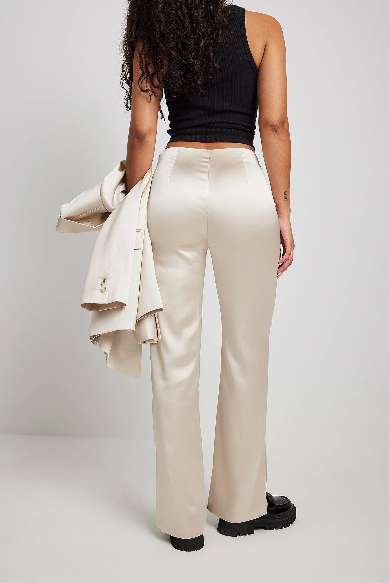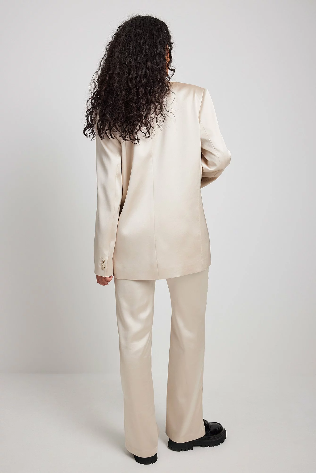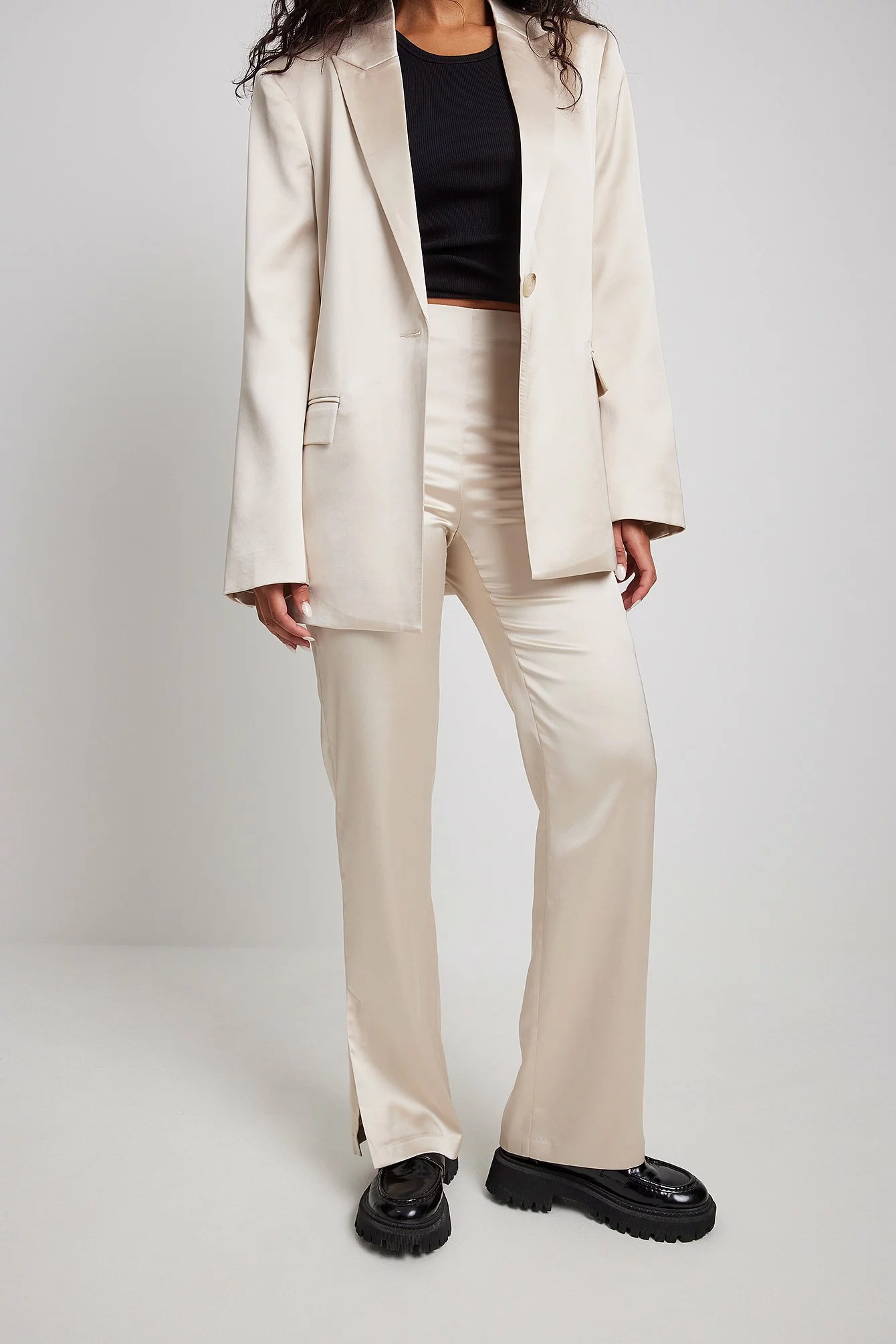 These pants are made of satin and feature a straight leg. They have a side pocket and a side slit. Inseam length in size 36: 80 cm / 31.49 in.