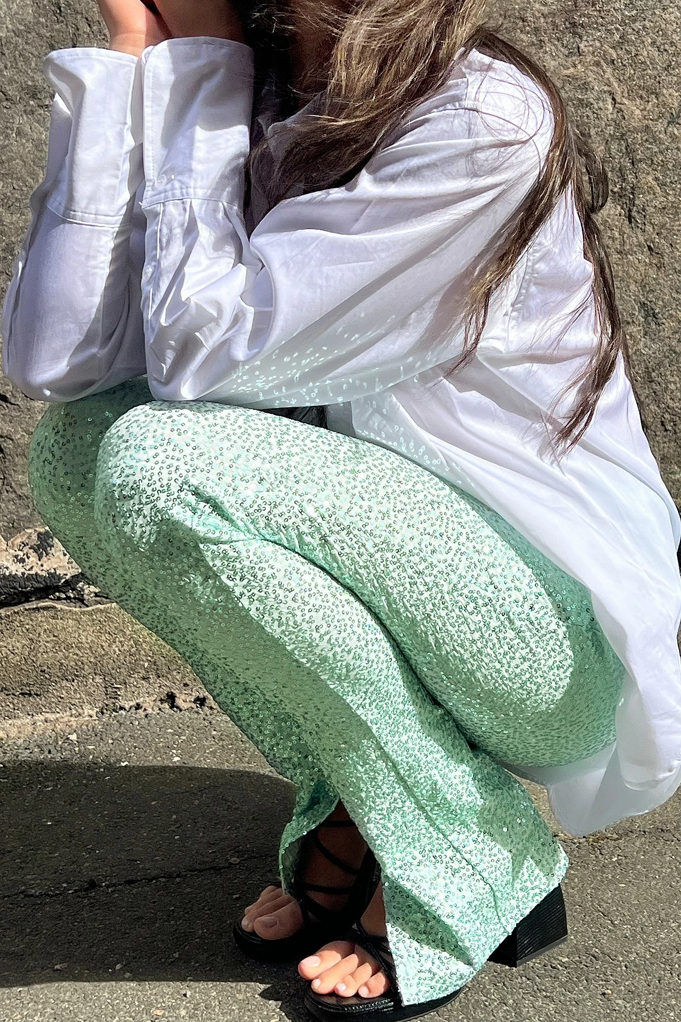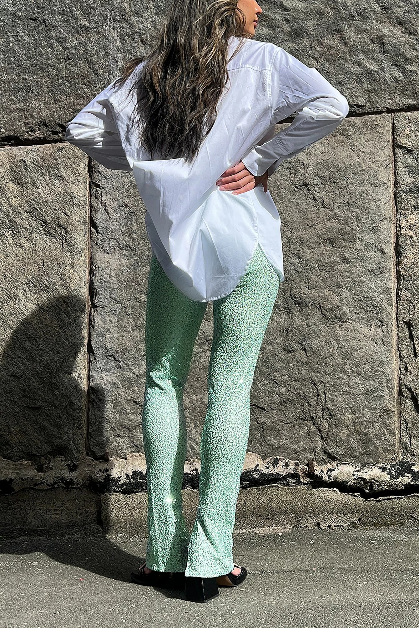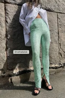 These pants are made of sequin and feature a high waist with a zip closure on the side, a slit on the leg and a stretchy material.