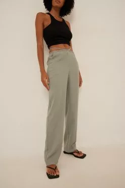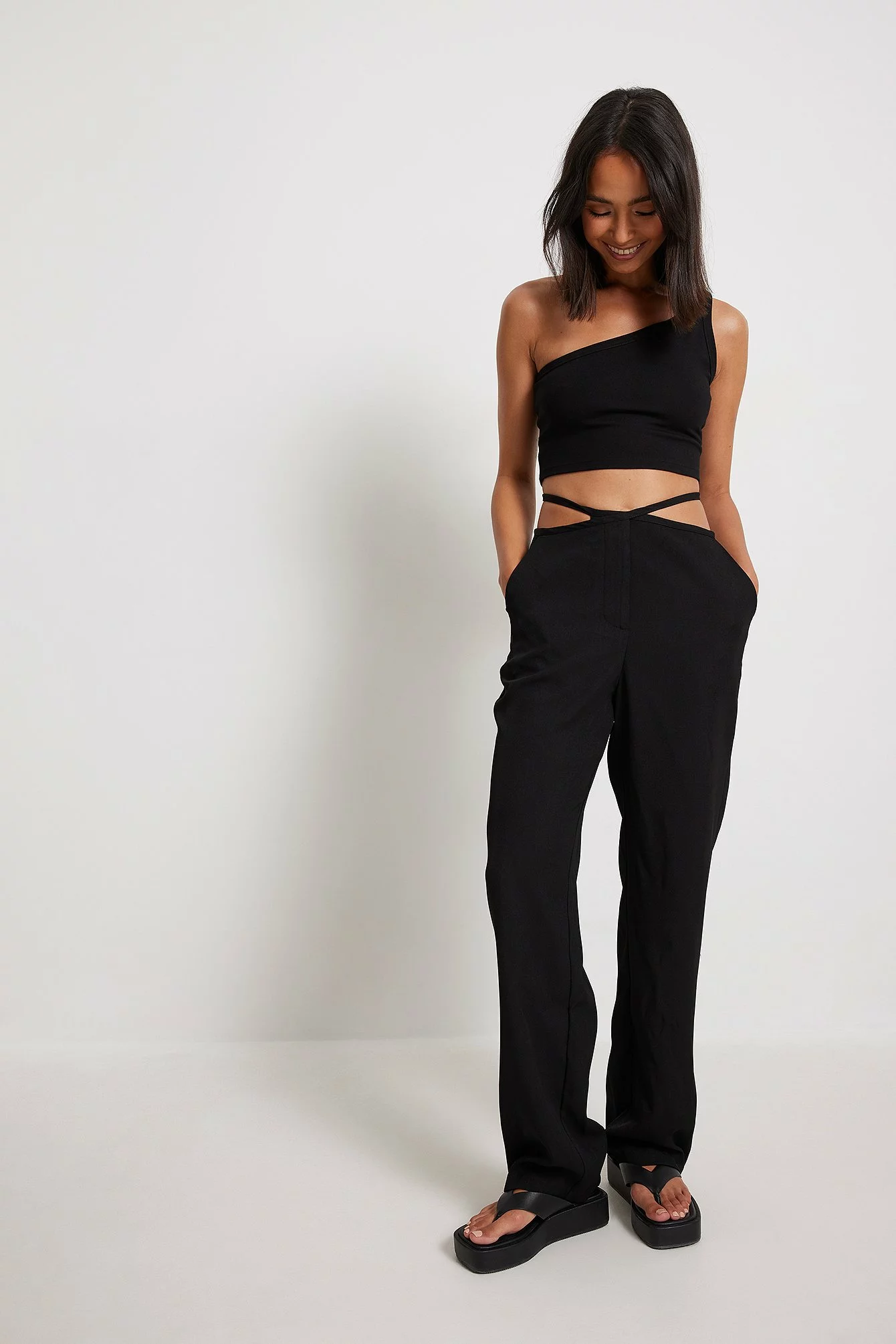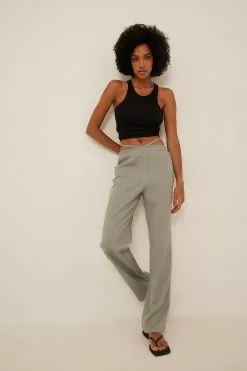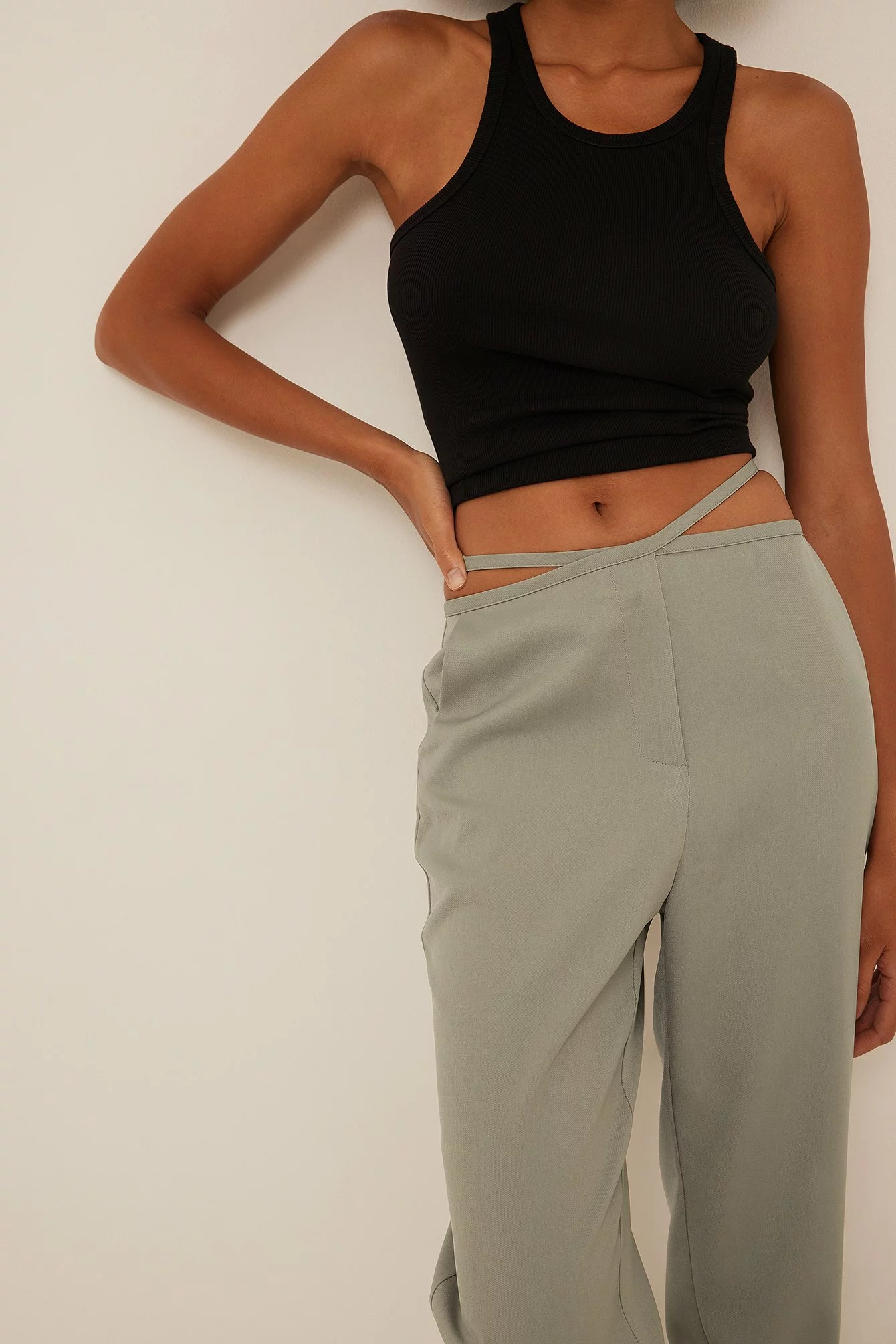 These suit pants feature a high waist with wrapped strap details, a zipper, hook and button closure, side pockets, back mock pockets and long wide legs.