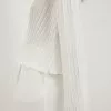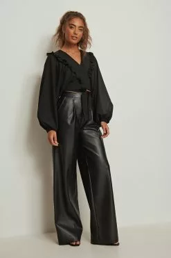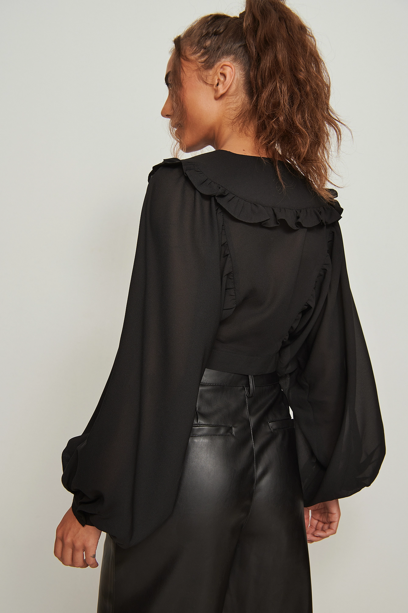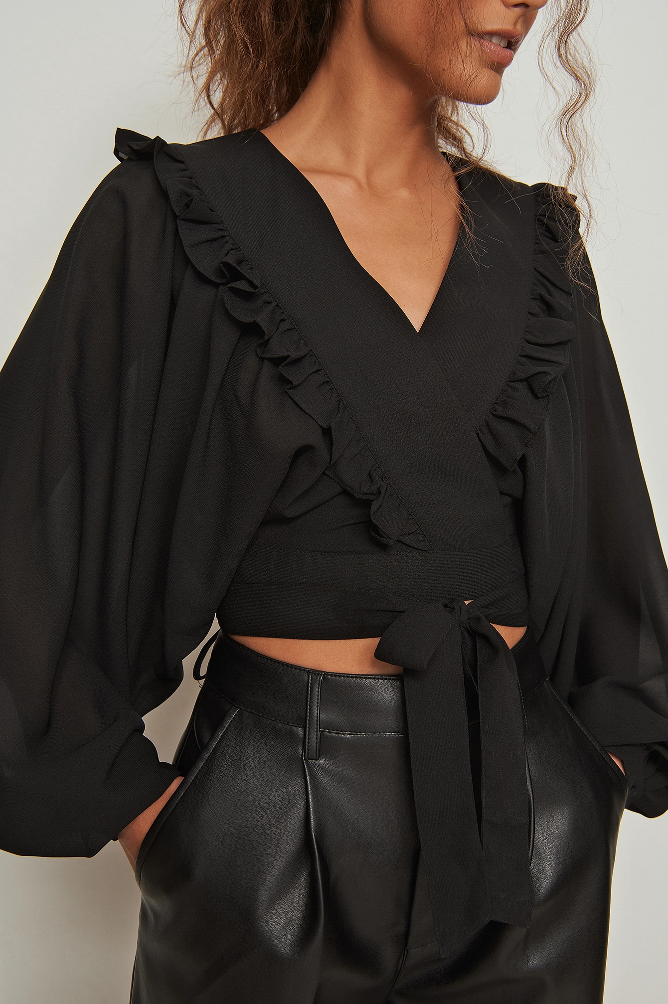 This blouse features a v neckline with ruching and an overlap style, volume long sleeves with single button cuffs and a self tie knot waist.