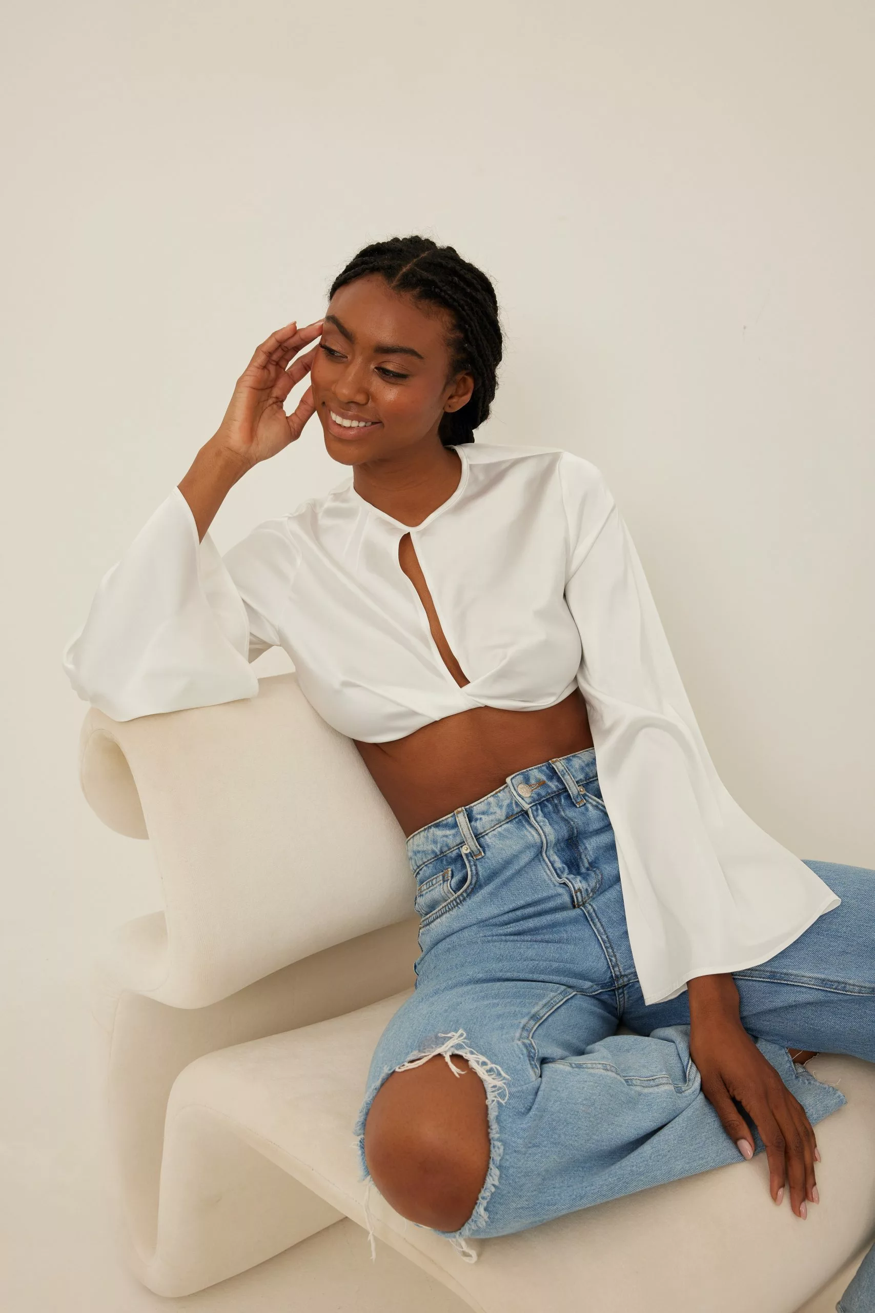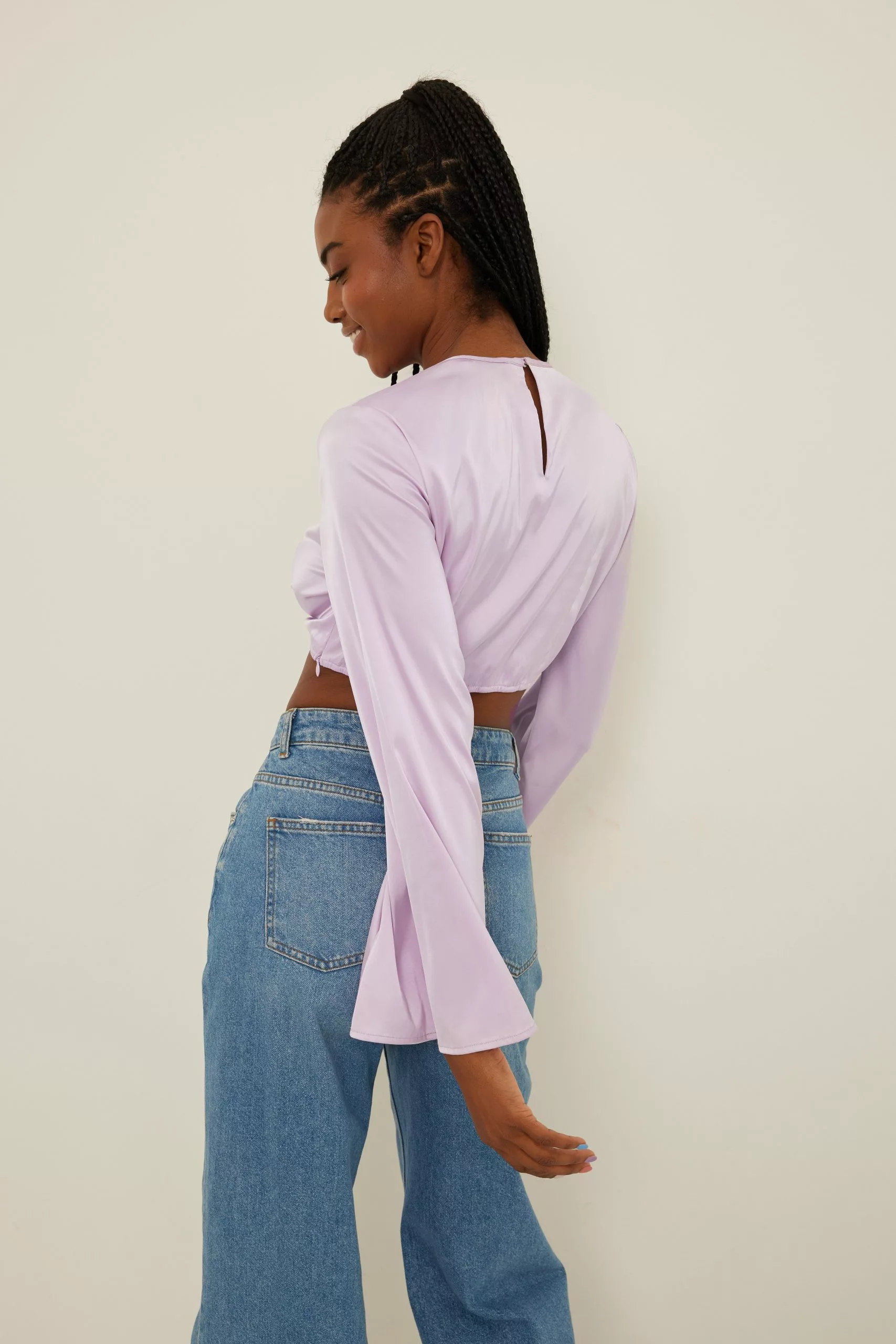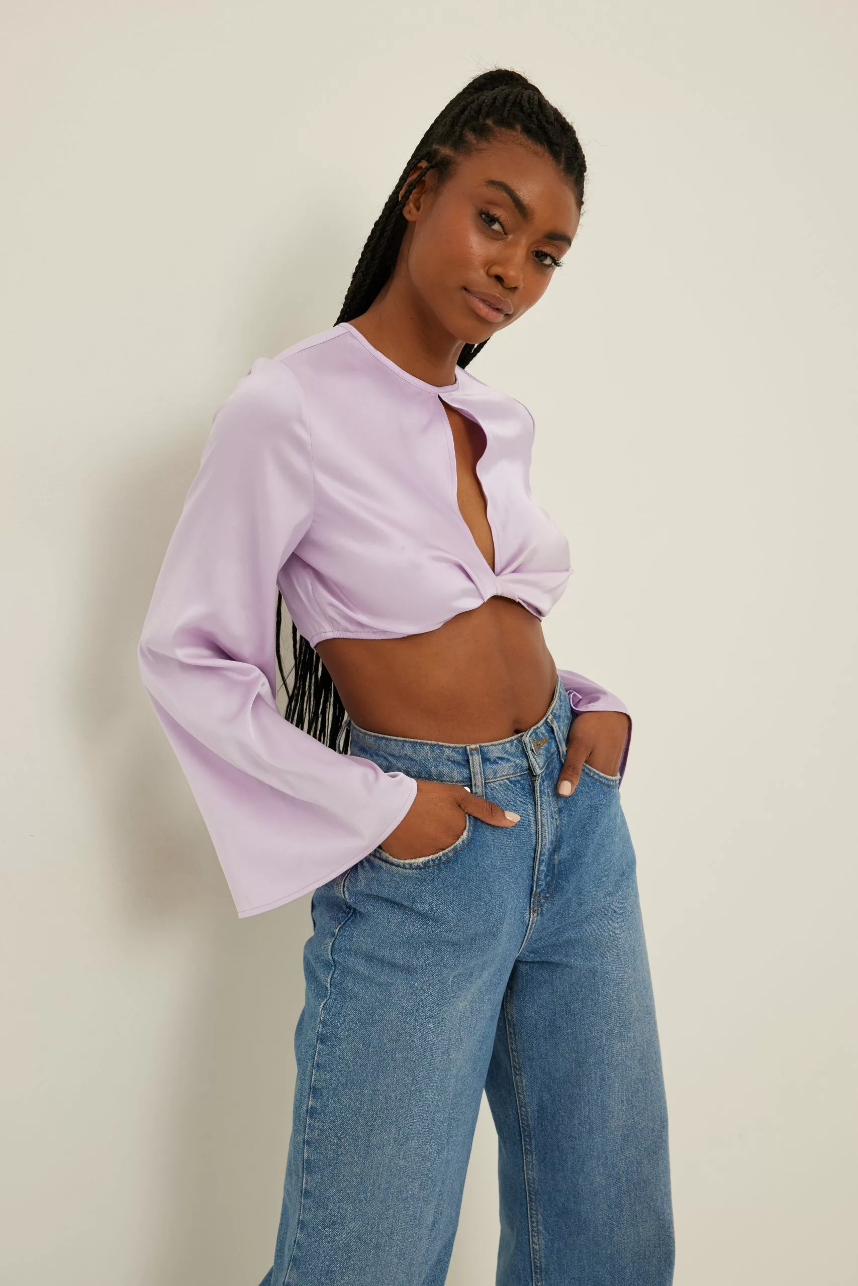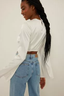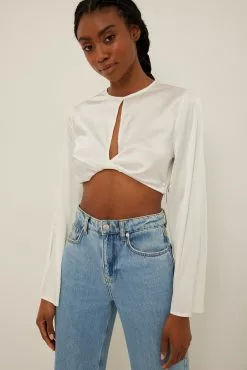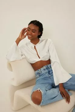 This blouse is cropped and features trumpet long sleeves, a cut out detail on the chest, a side zipper closure and a button closure at the back.