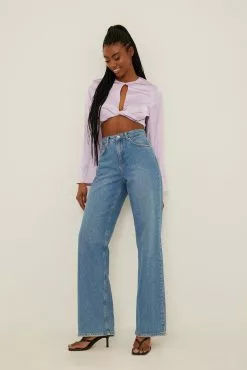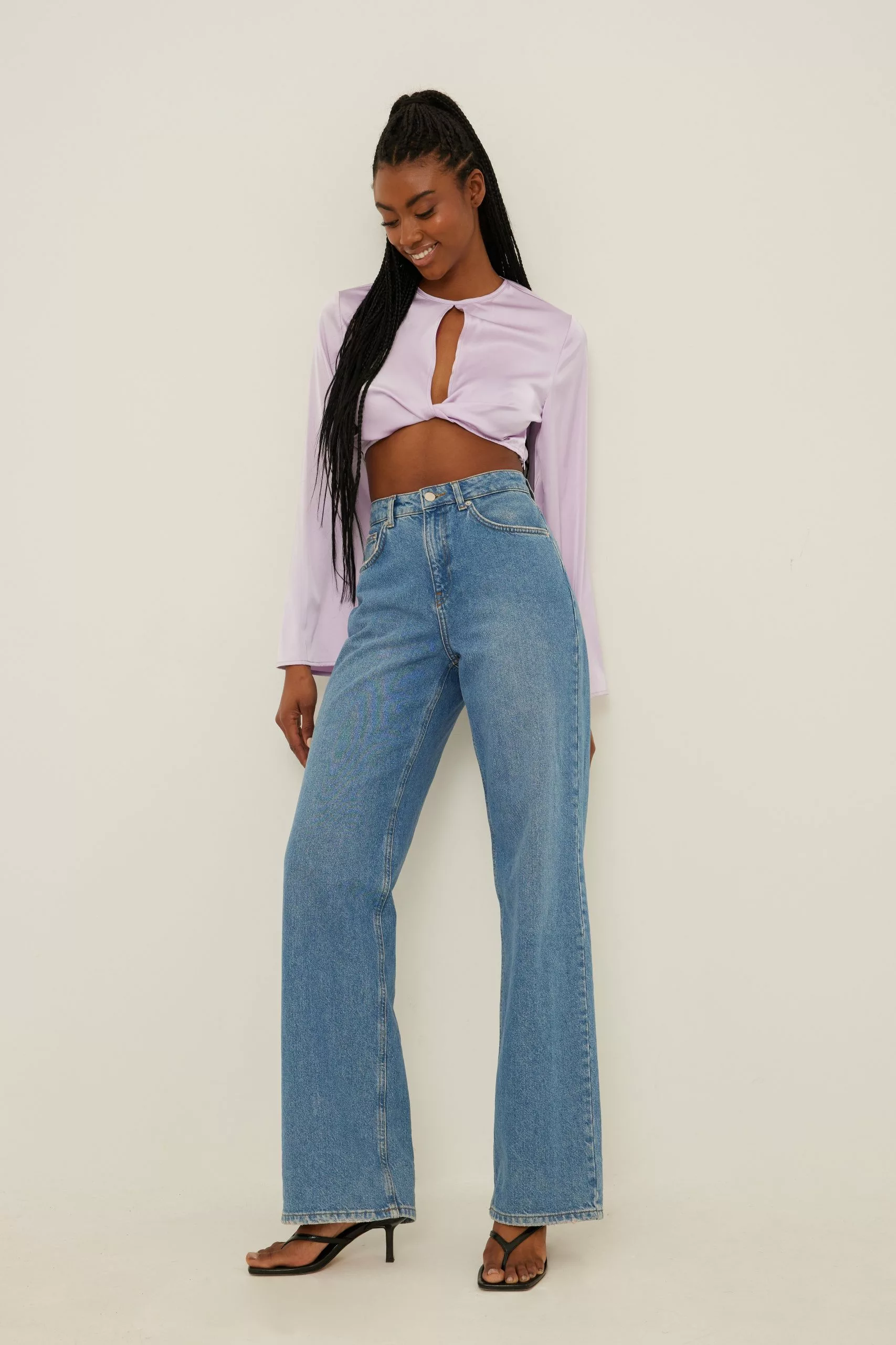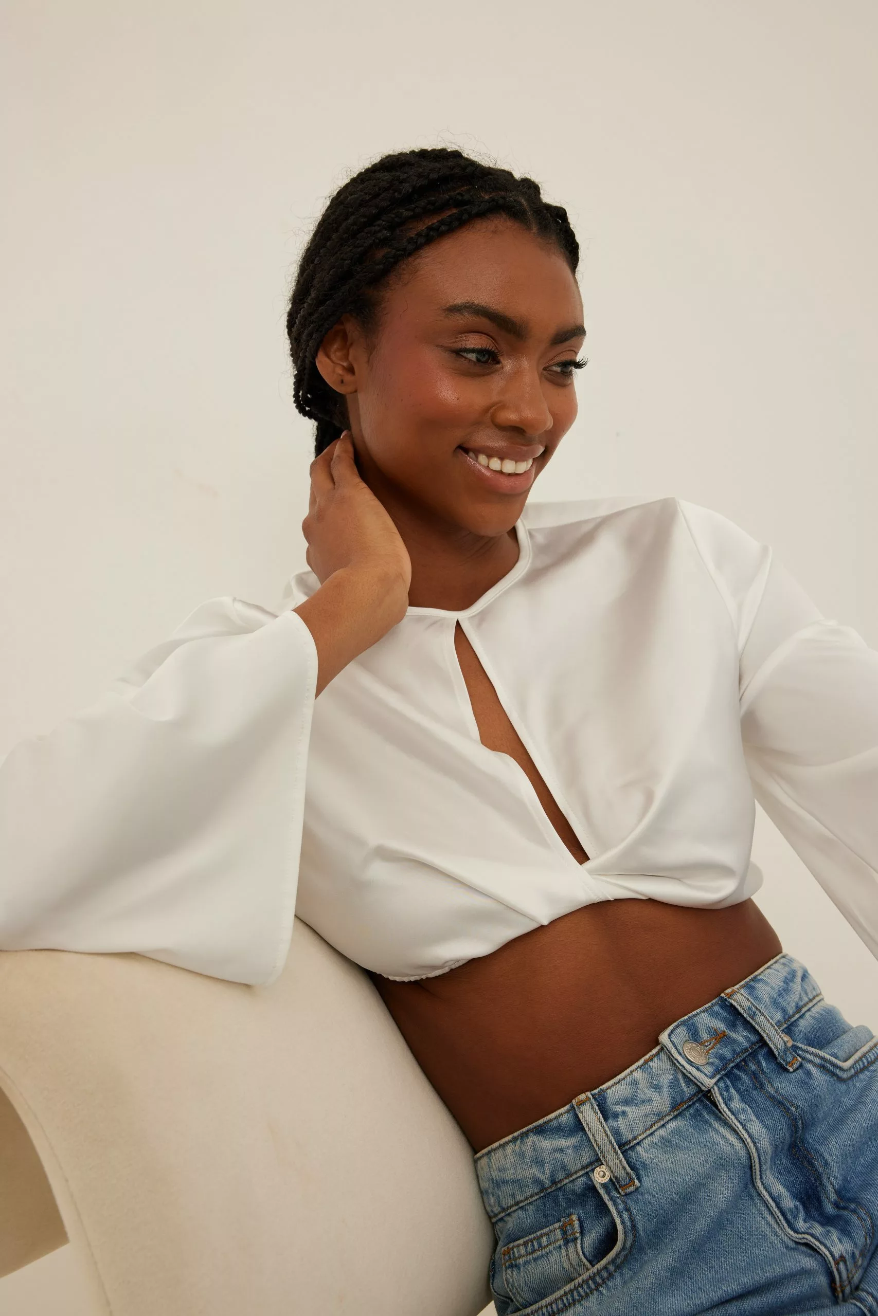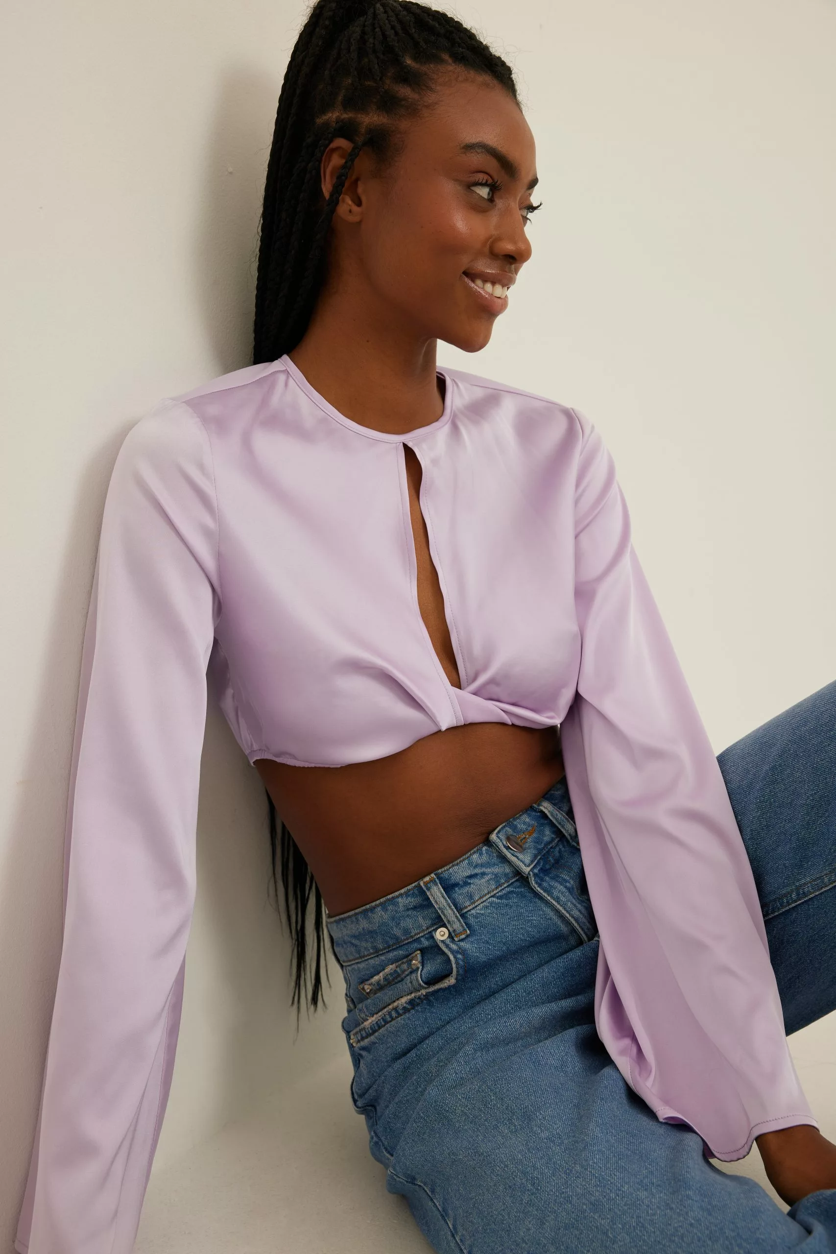 This blouse is cropped and features trumpet long sleeves, a cut out detail on the chest, a side zipper closure and a button closure at the back.