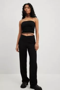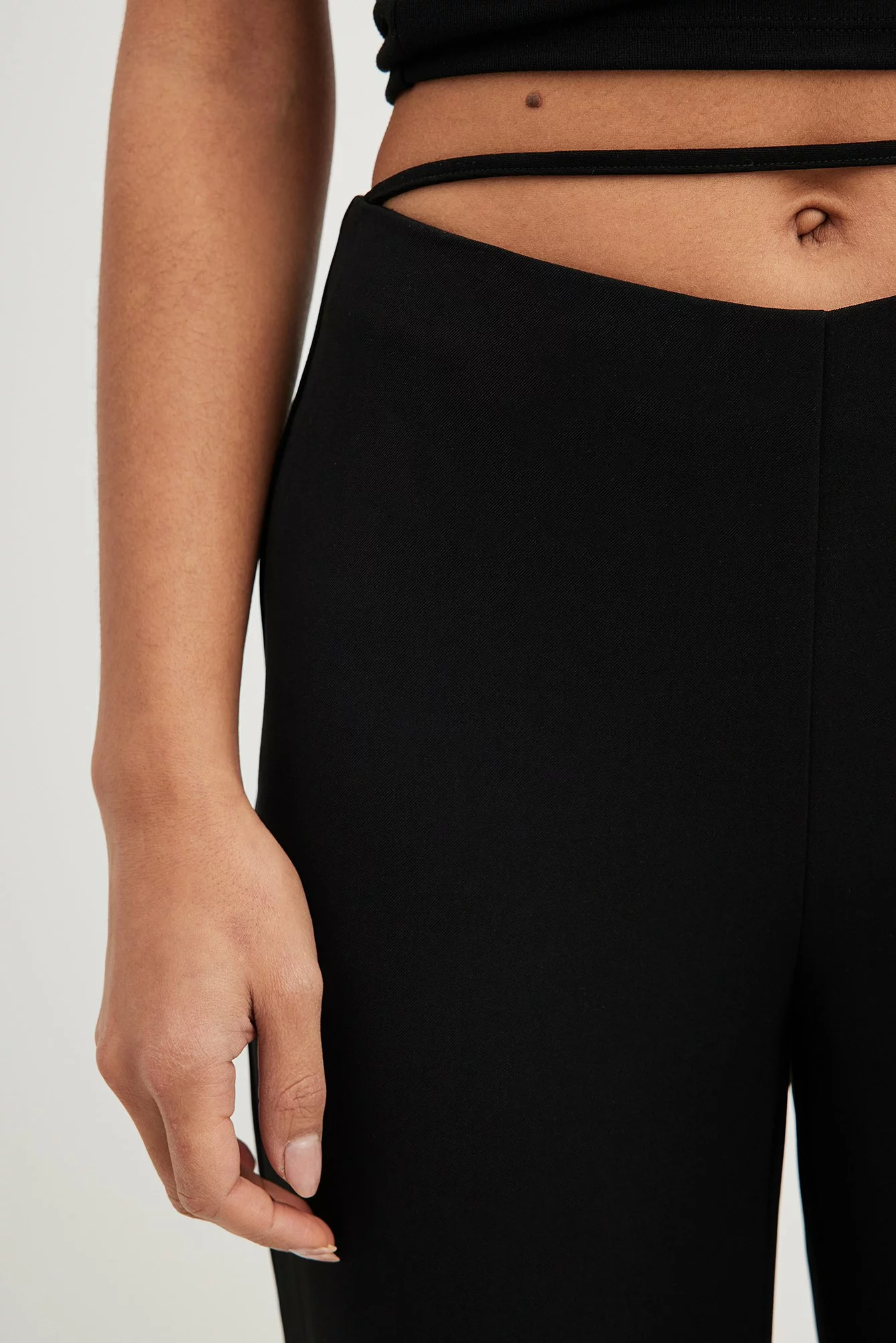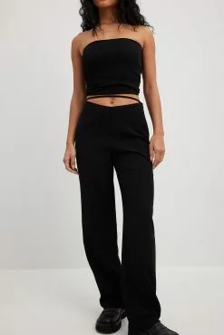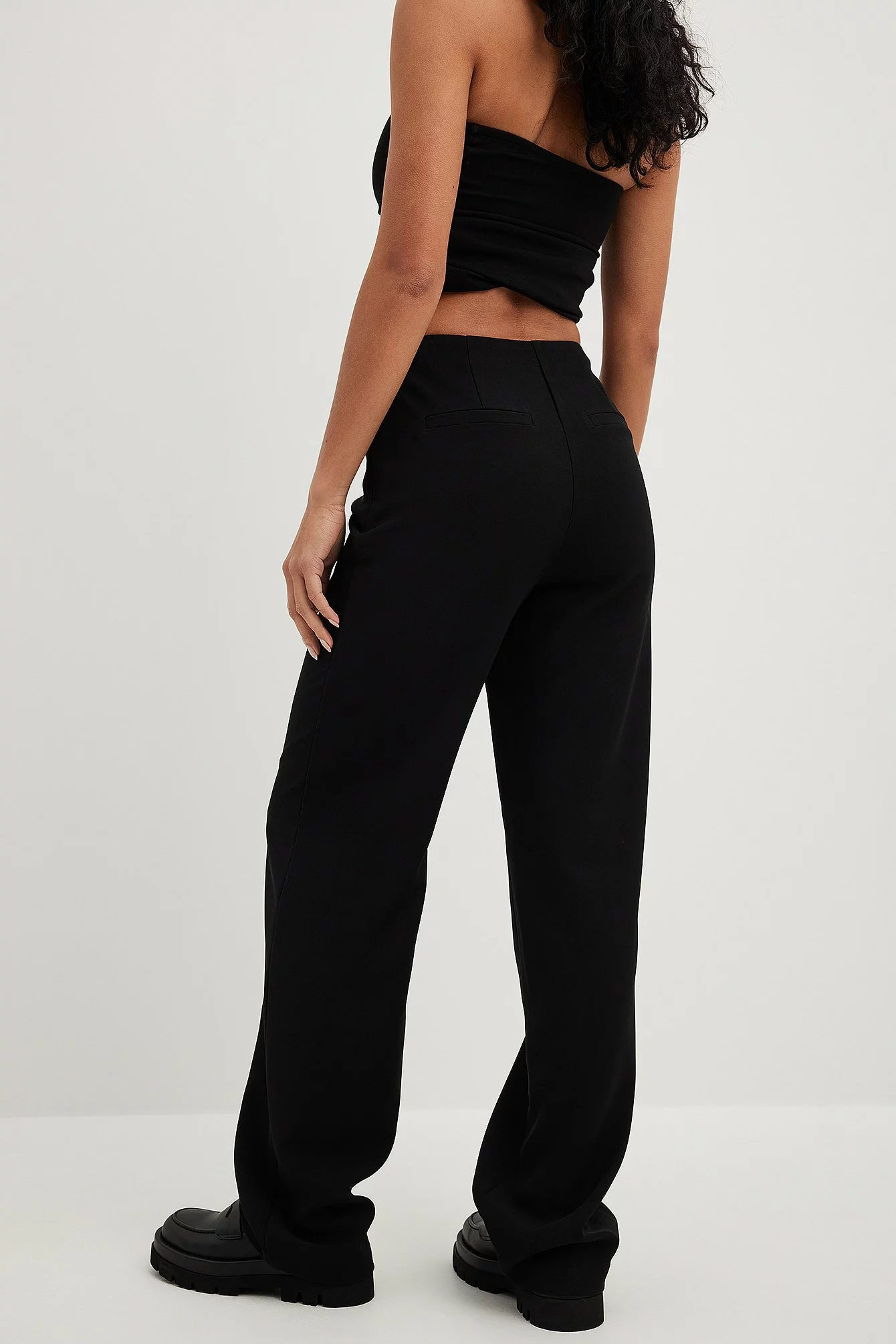 These suit pants are slightly stretchy and feature a straight fit. They have a v-shaped waist with a strap detail and a hidden side zipper closure. These suit pants feature back mock pockets.