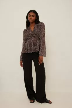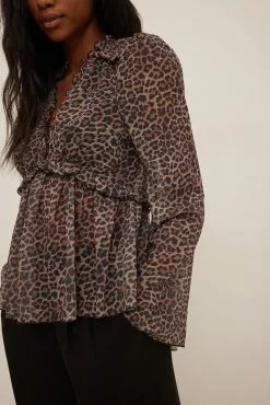 This blouse features a v neckline with frill details, wide long sleeves, a sheer material and a flowy fit.