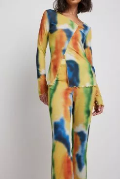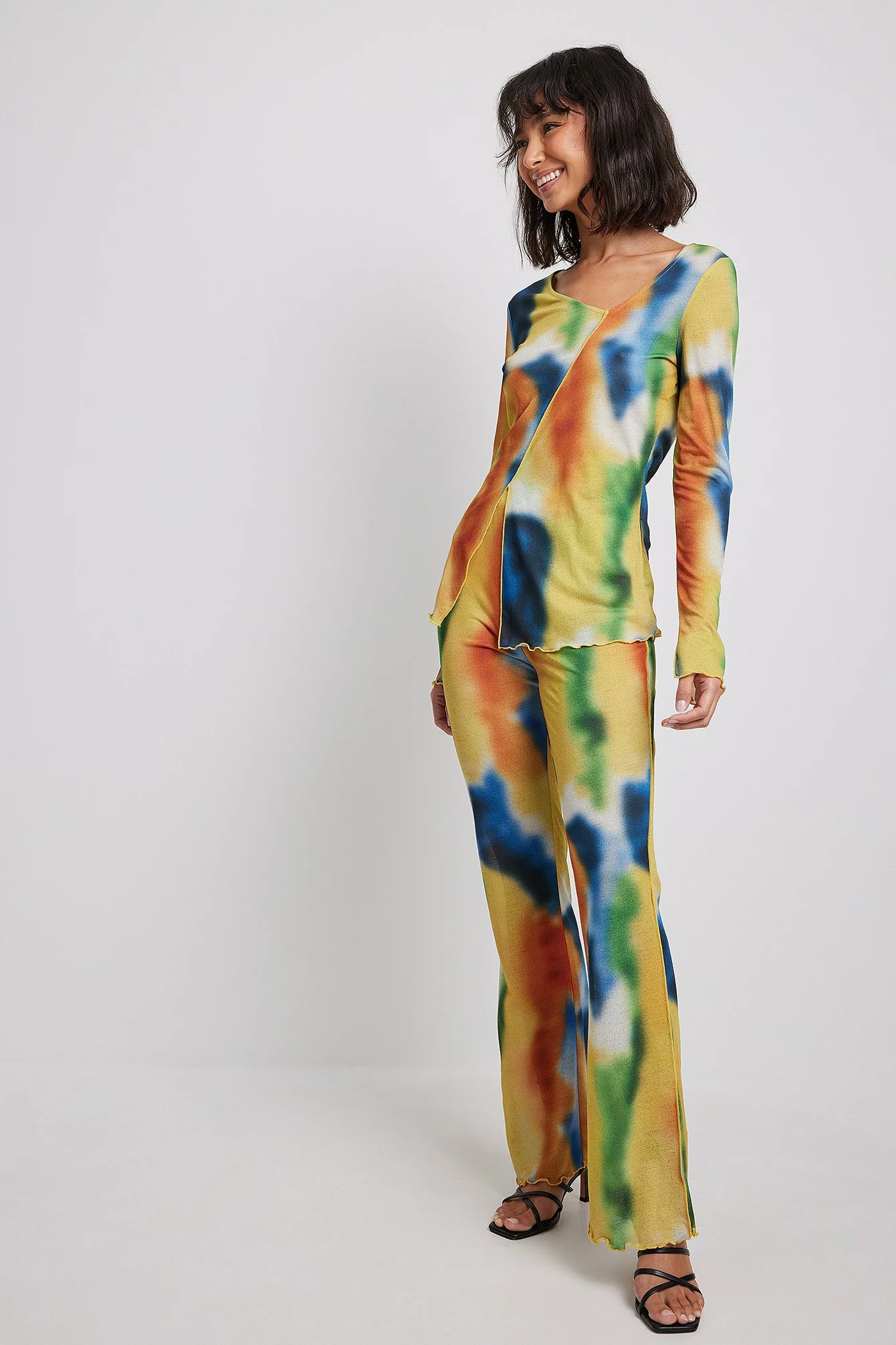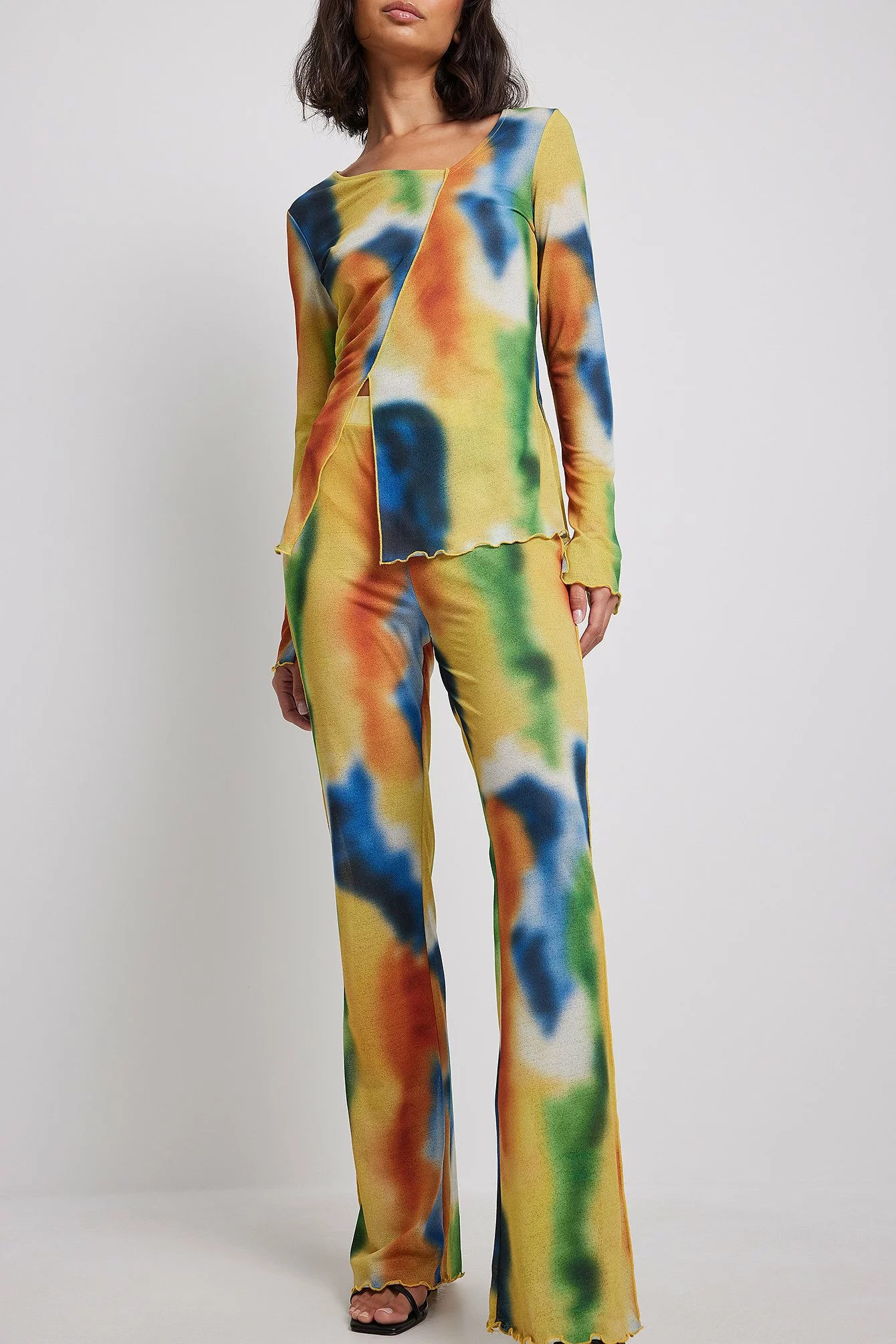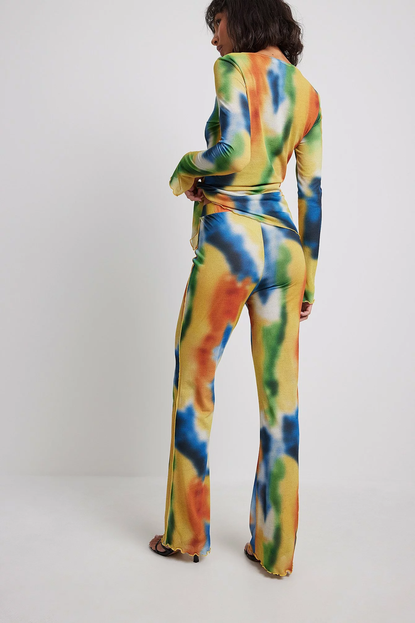 These trousers are sheer and printed and feature an elasticized waistband and a babylock design on the bottom hem and on the sides.