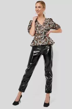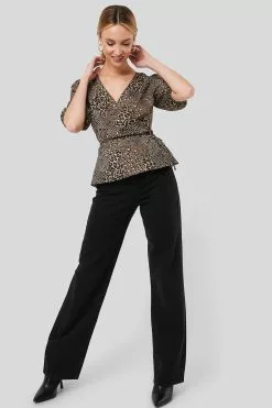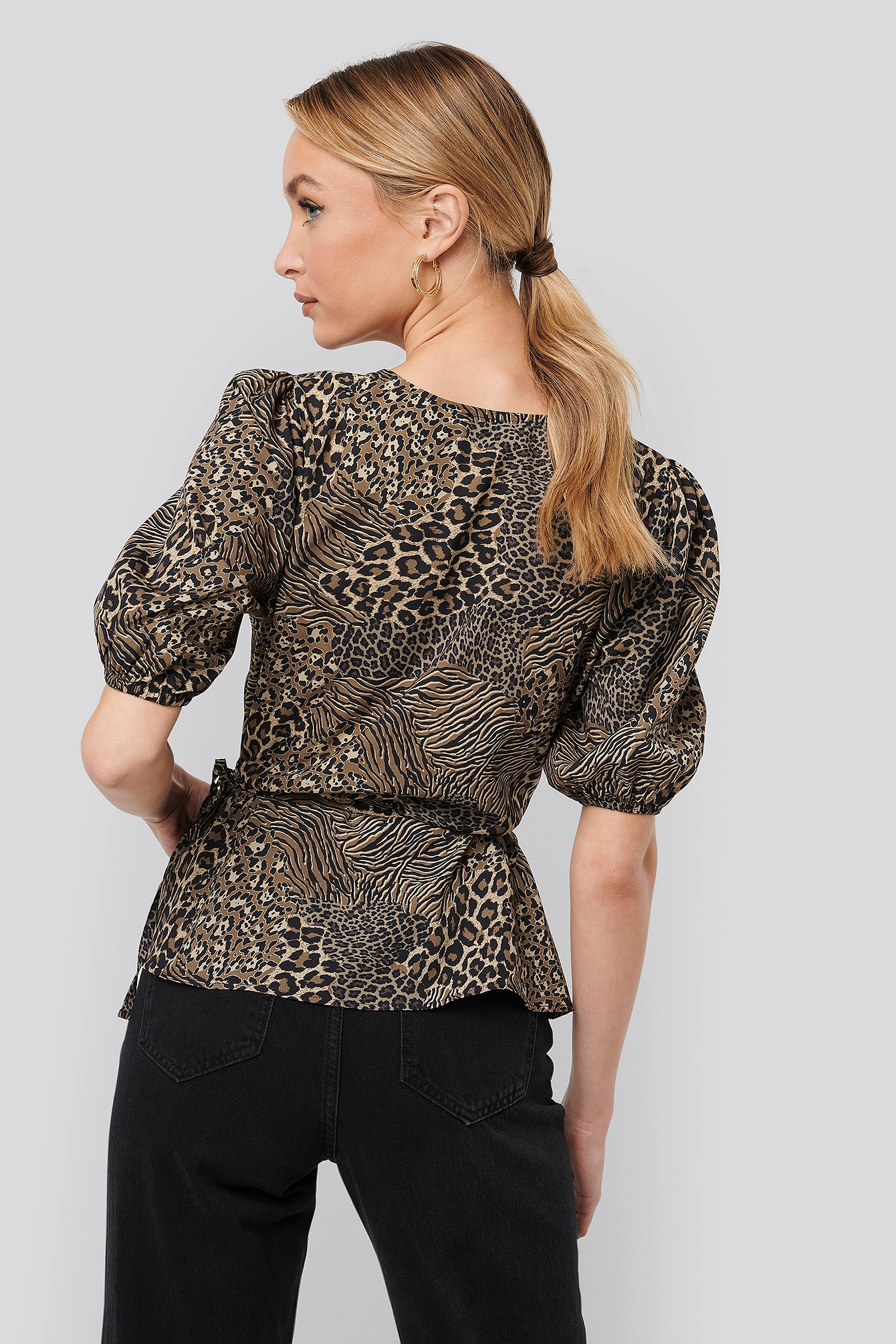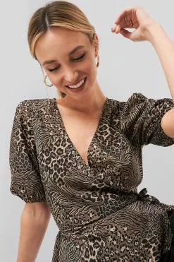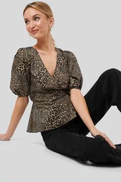 This blouse features a v neckline, short puff sleeves, a self-tie band at the waist, a flounced detail and a wrap design.