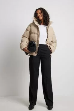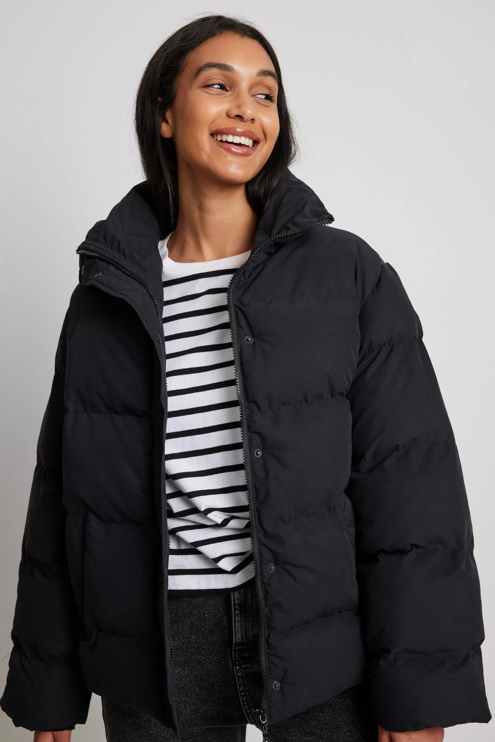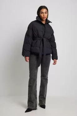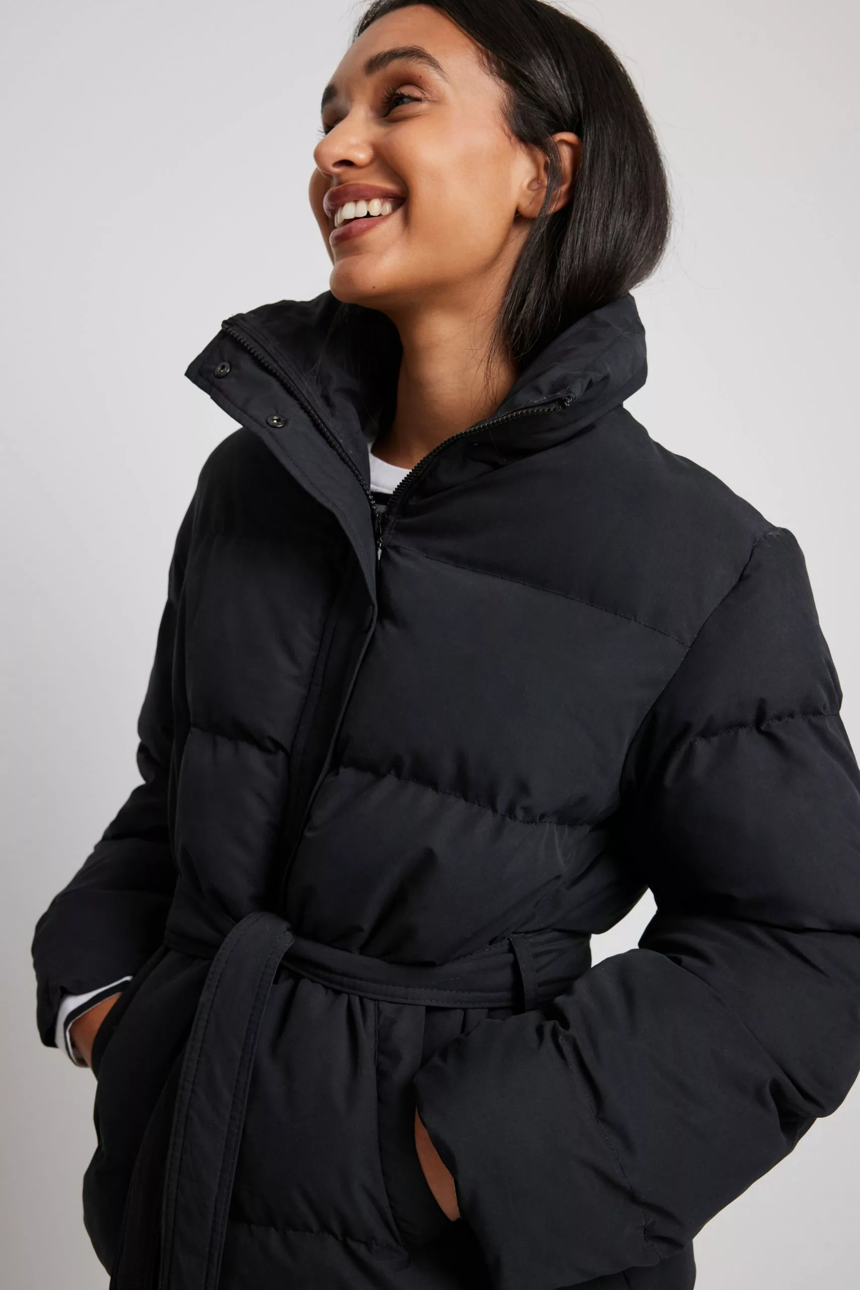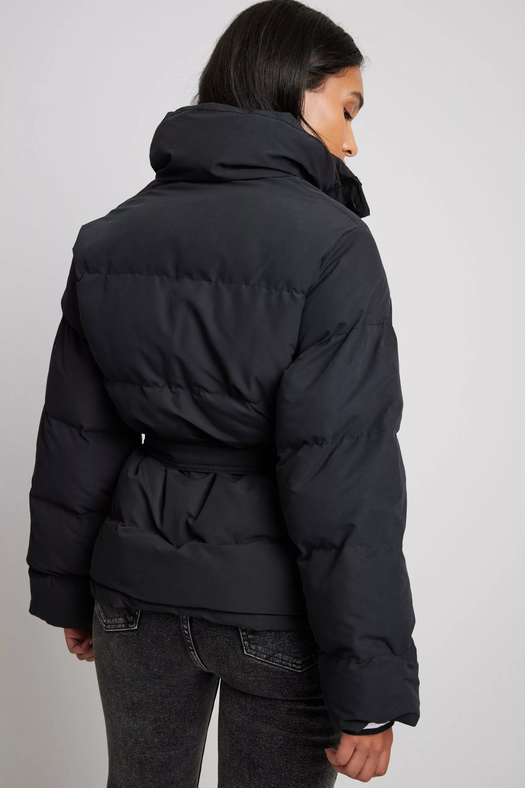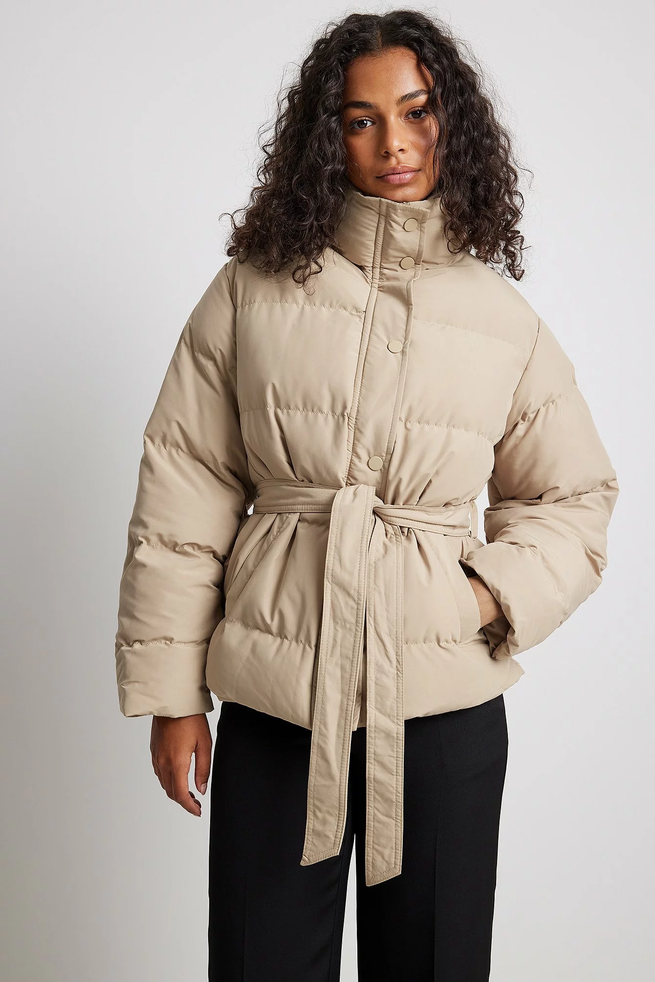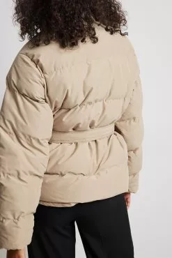 This padded jacket features a high neck, long sleeves, a zipper and button closure, two side pockets and a removable, adjustable belt.