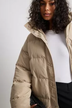 This padded jacket features a high neck, long sleeves, a zipper and button closure, two side pockets and a removable, adjustable belt.