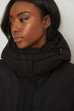 This jacket is padded and water repellent and features a high neck. It has a removable padded hood with adjustable drawstrings and two snap buttons and long sleeves with ribbed, elastic cuffs. This jacket features a zipper and button closure down the front, a removable self-tie belt at the waist, two side pockets and a long fit.