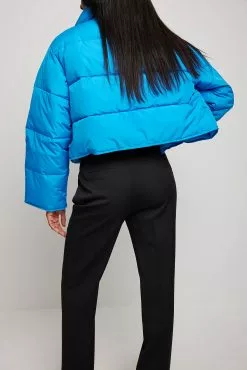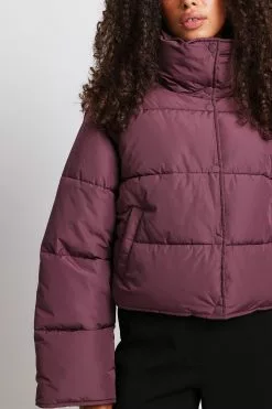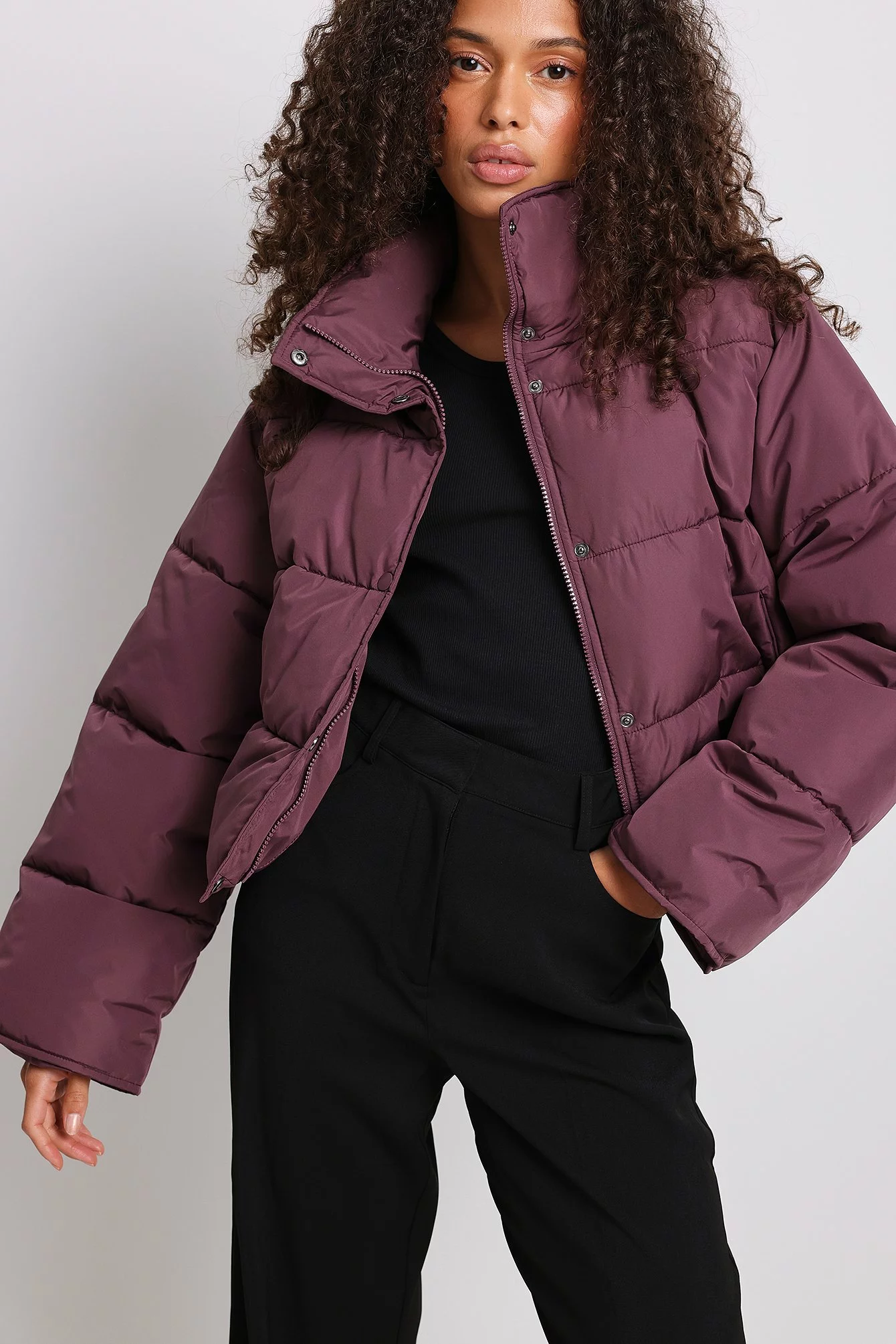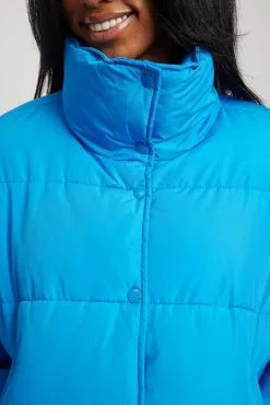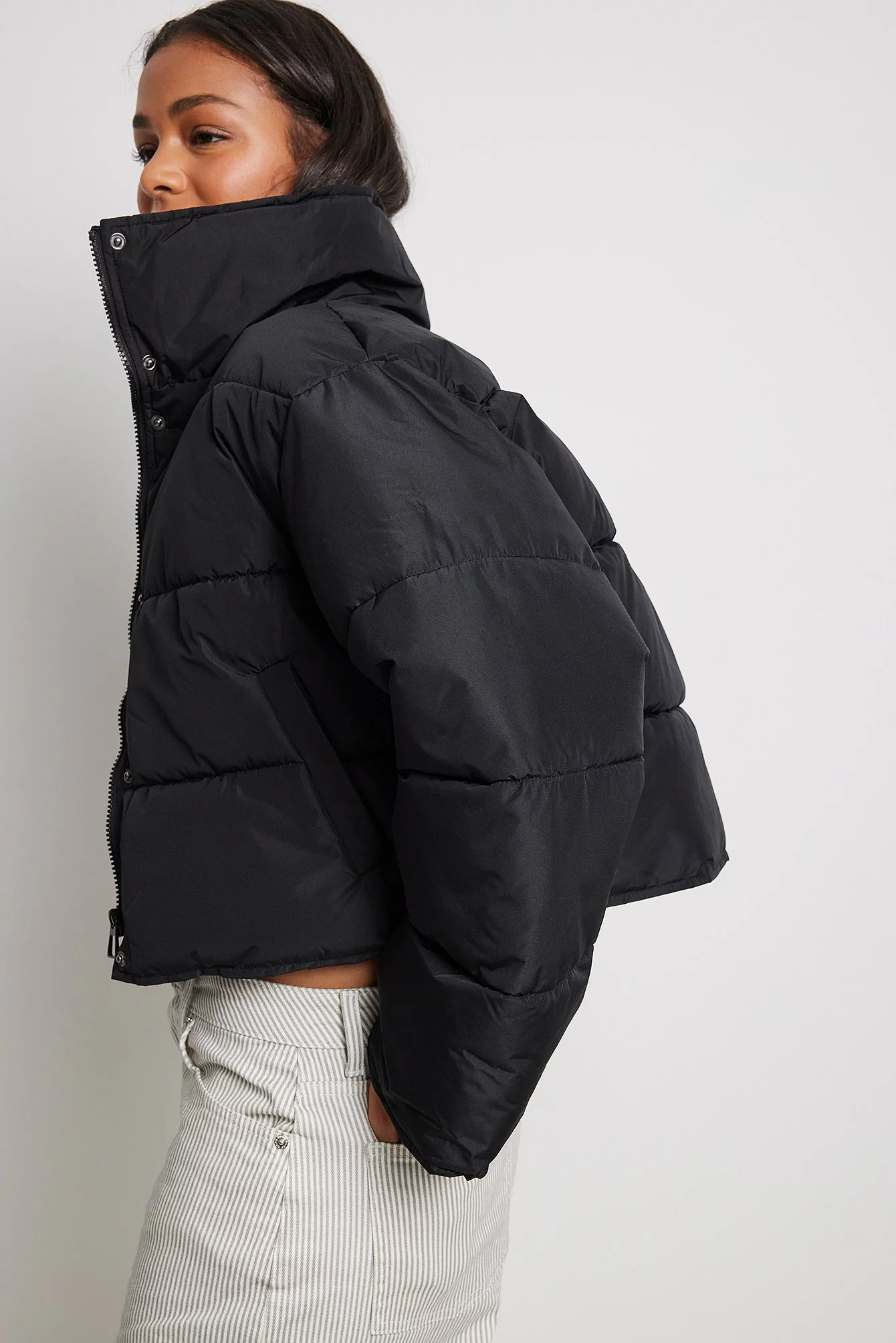 This jacket is water repellent and features cropped length, a high neck, long sleeves, a zipper and button closure and side pockets.
