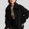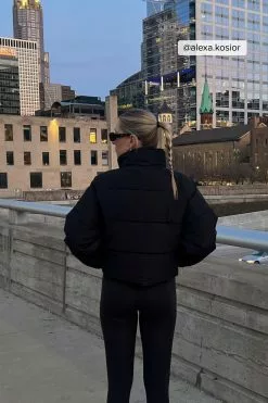 This jacket is water repellent and features cropped length, a high neck, long sleeves, a zipper and button closure and side pockets.