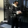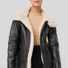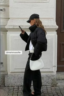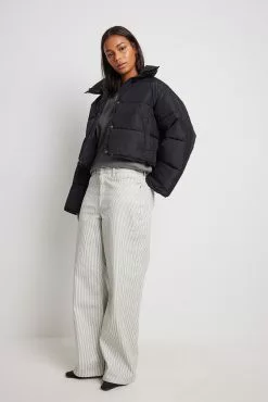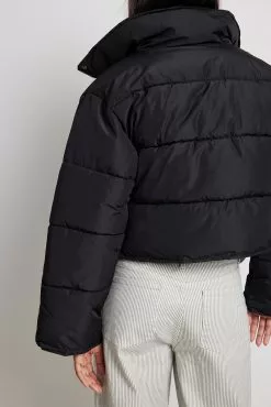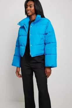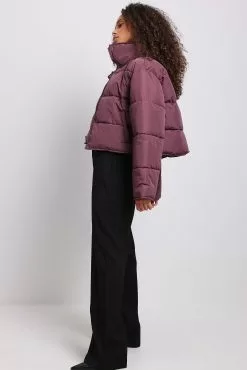 This jacket is water repellent and features cropped length, a high neck, long sleeves, a zipper and button closure and side pockets.