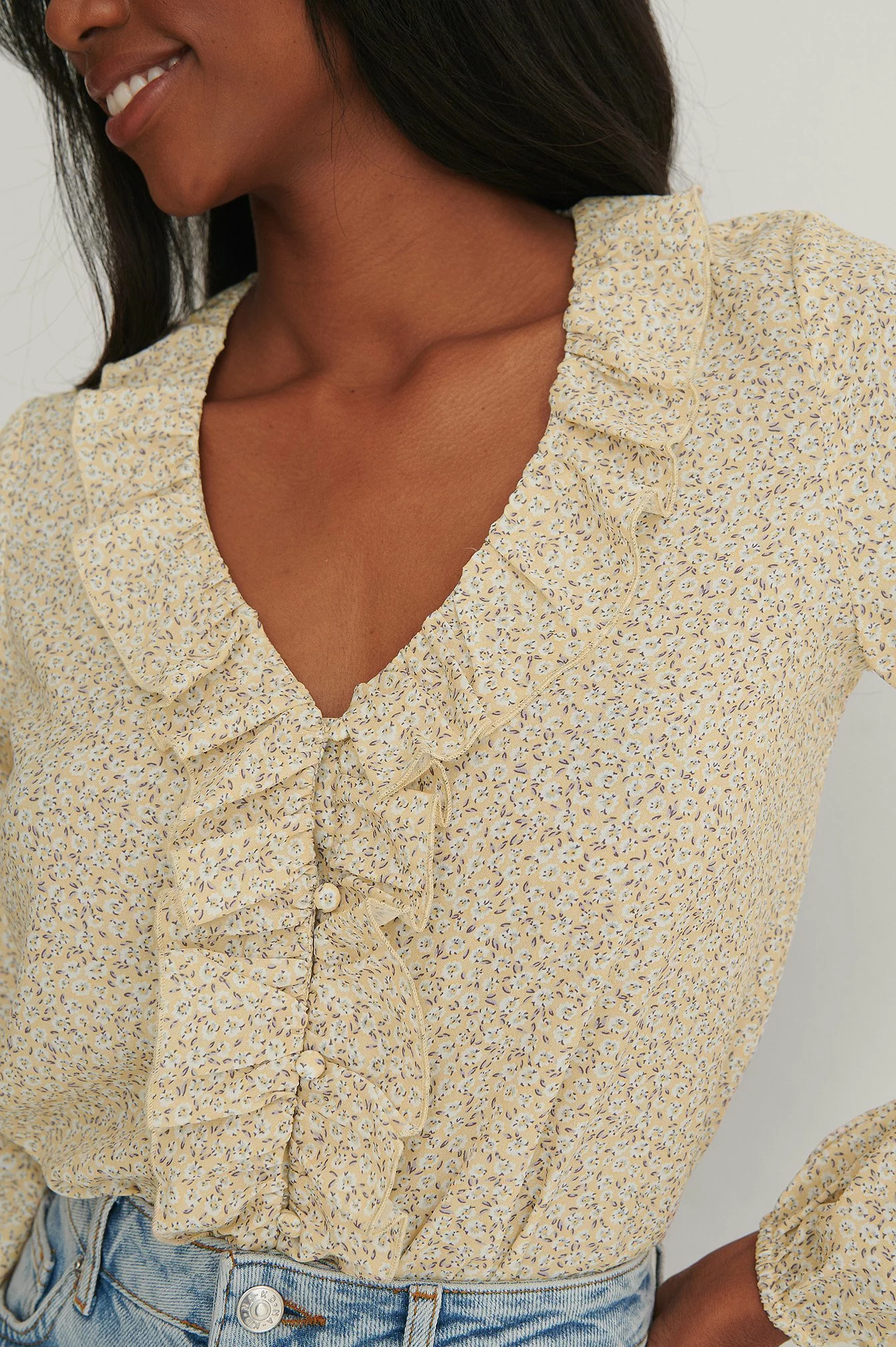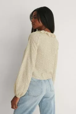 This blouse features a frilled v neckline with button closures along the front, long balloon sleeves with elasticized cuffs and a flowy fit.
