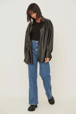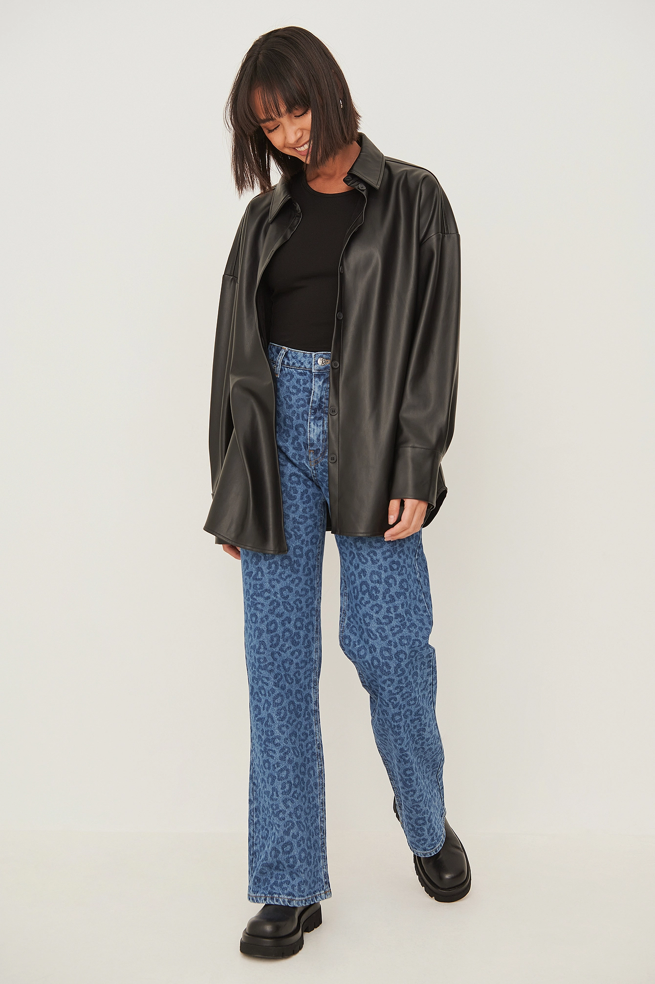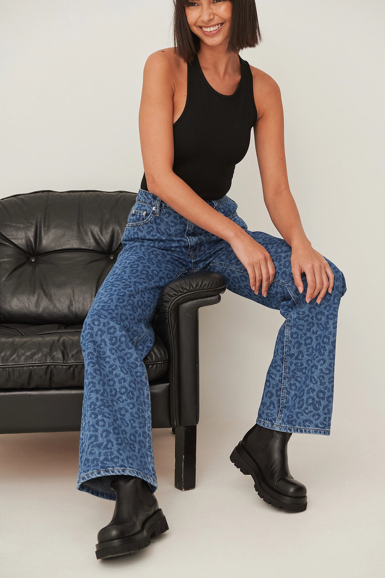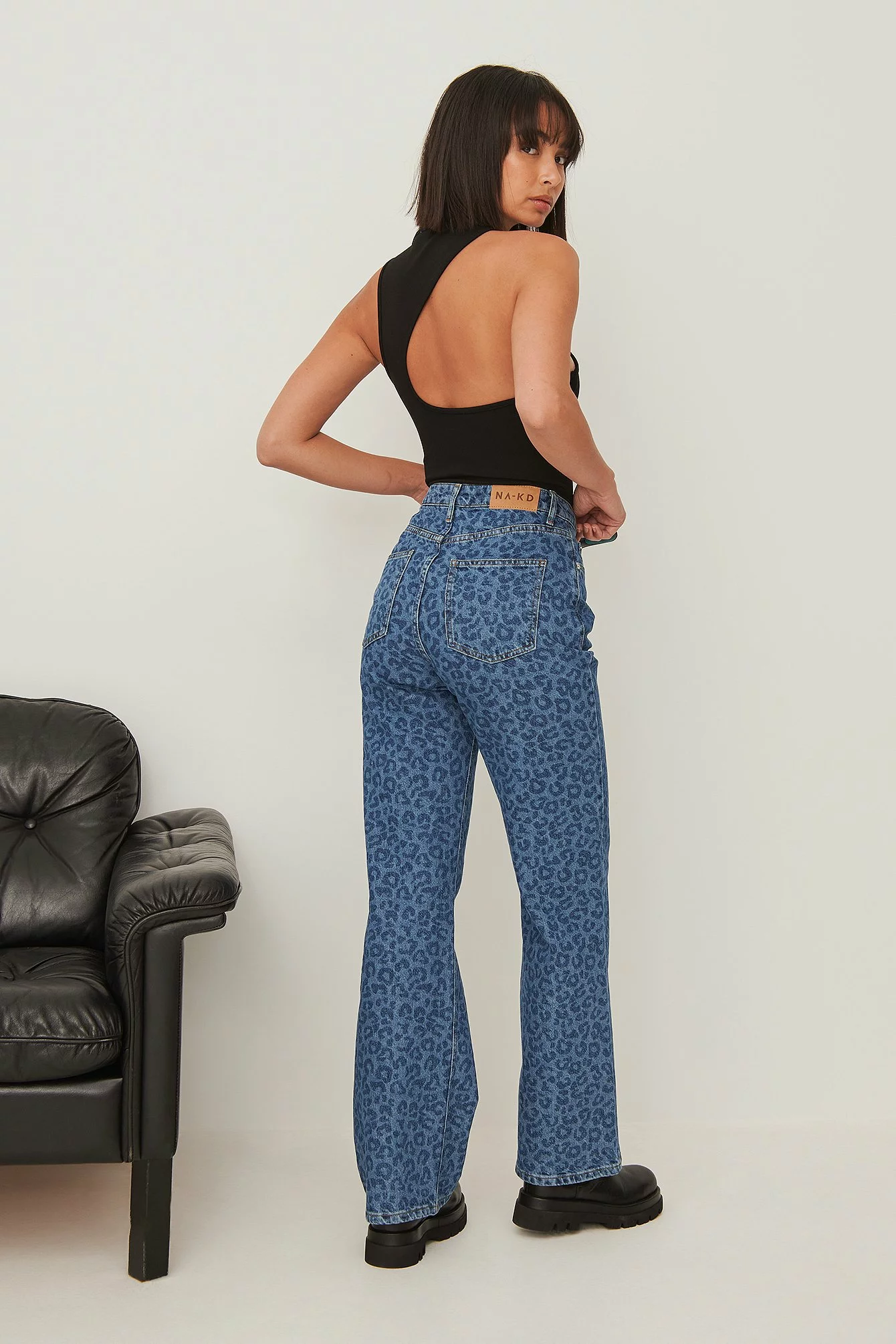 These 5-pocket jeans feature a high waist with belt loops. They have a zipper and button closure and straight legs. These 5-pocket jeans feature a printed design.