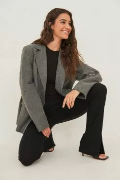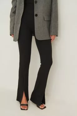 These pants feature a high elasticized waist, slit details at the bottom, a stretchy, ribbed material and straight legs.