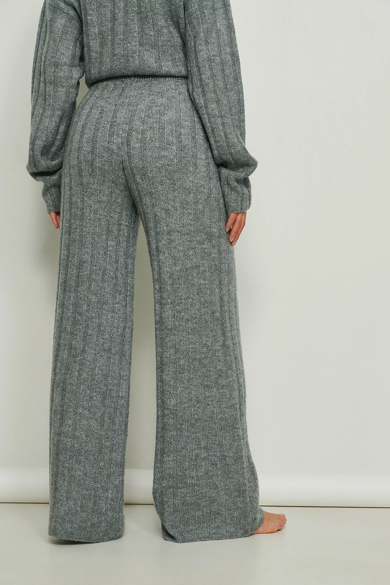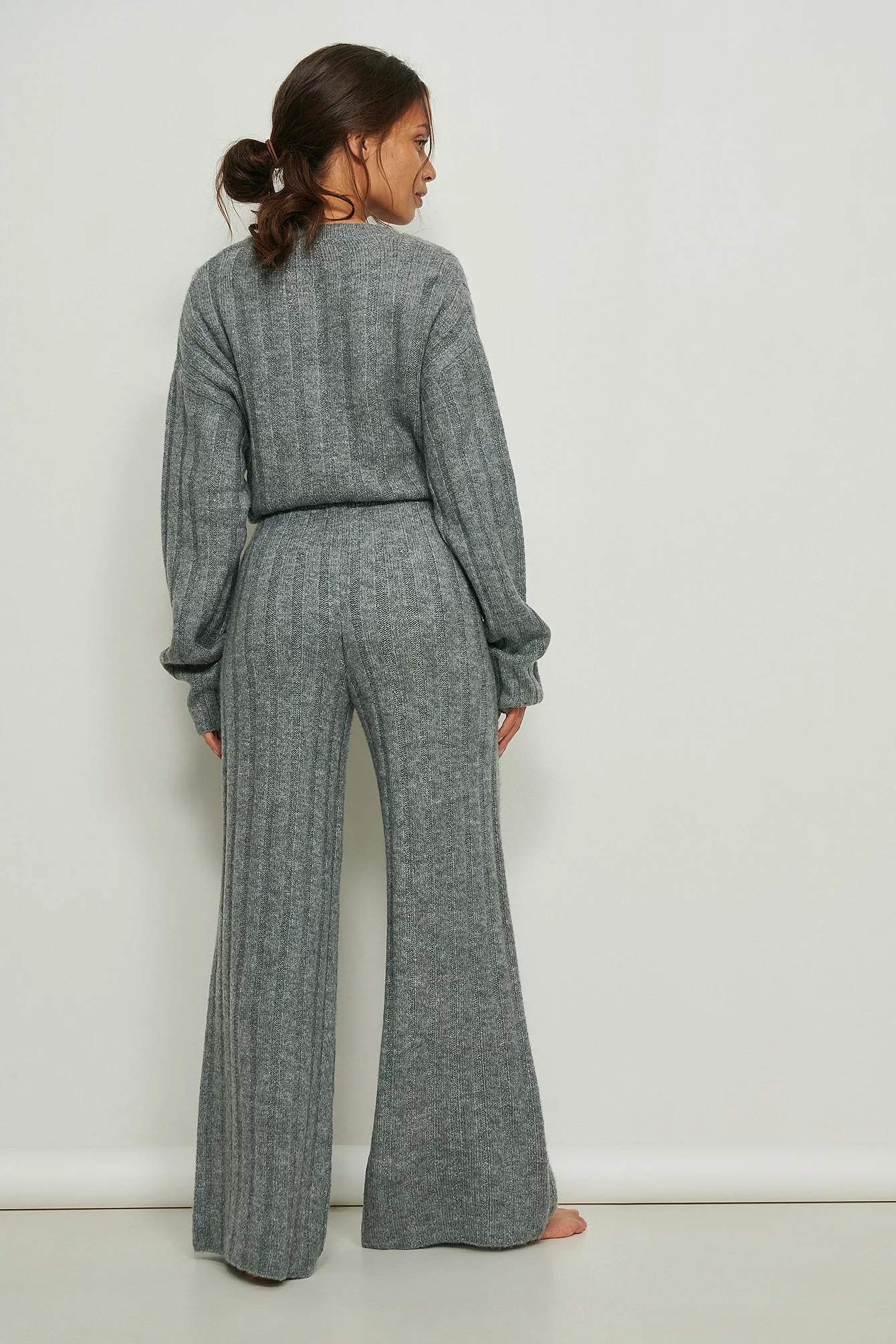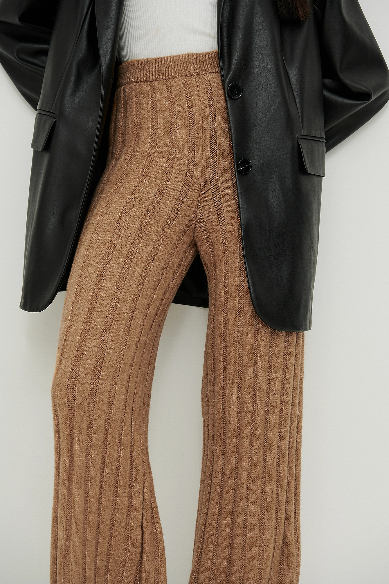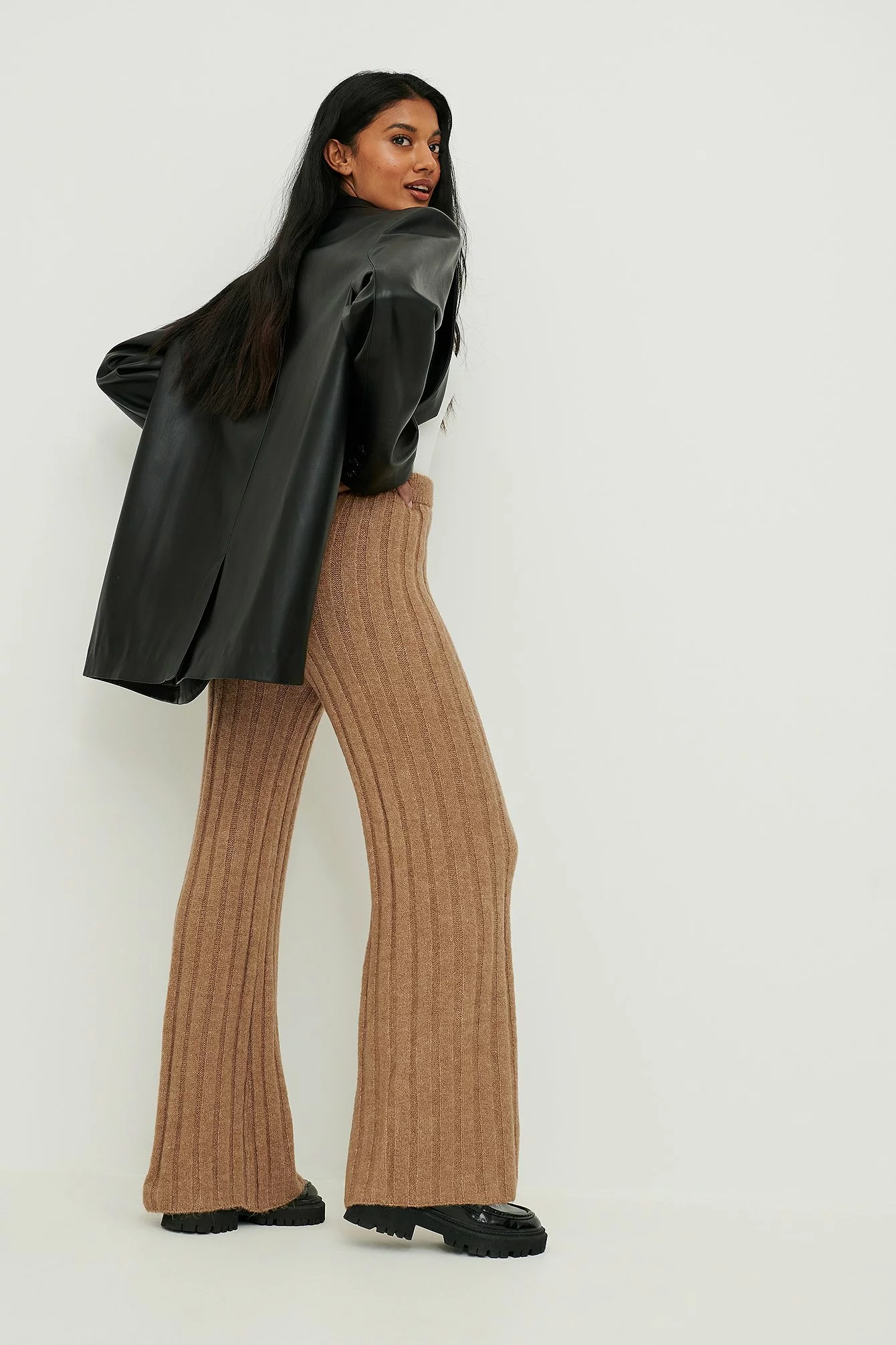 These wide leg pants are knitted and ribbed and feature a high waist and an elasticized waistband.