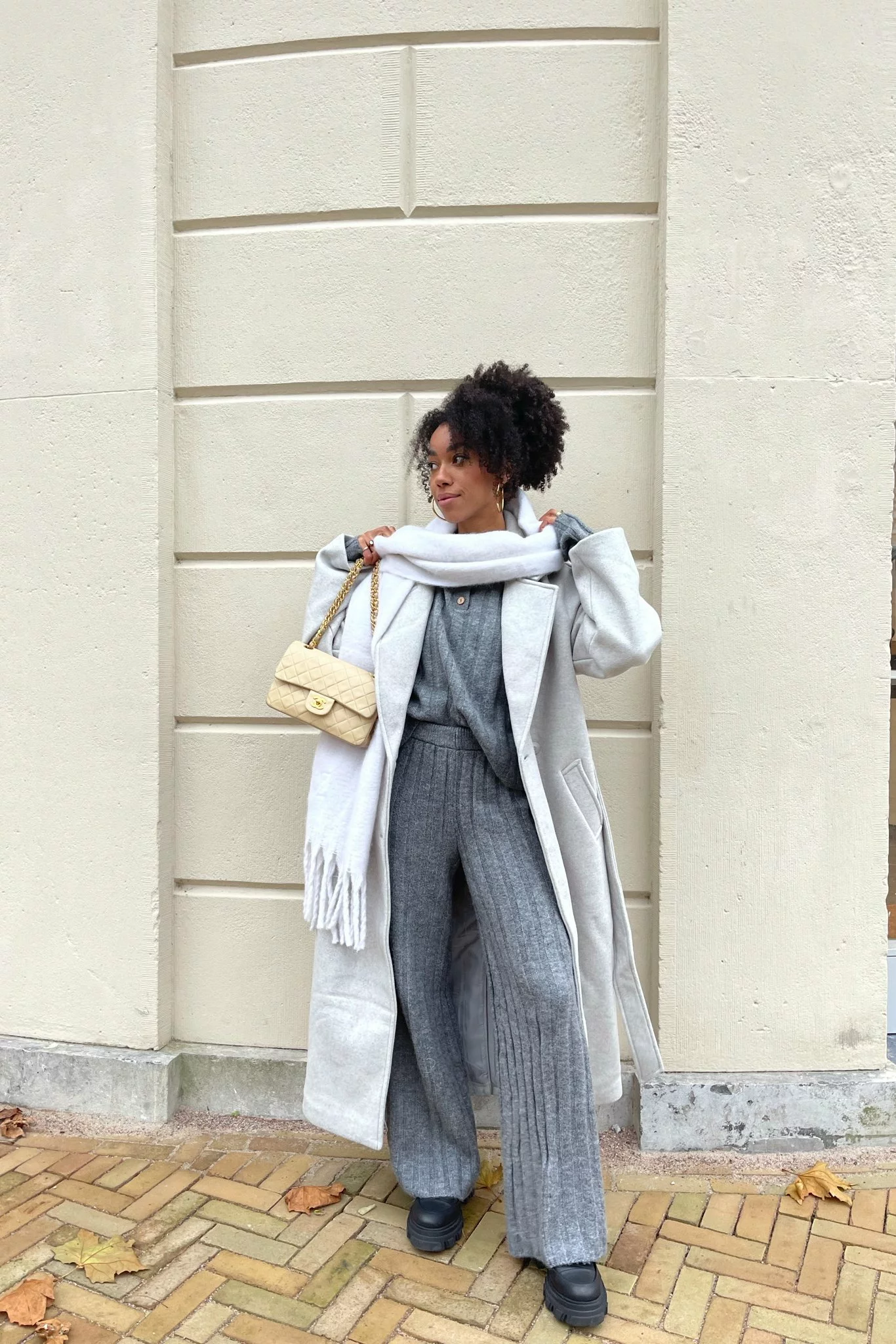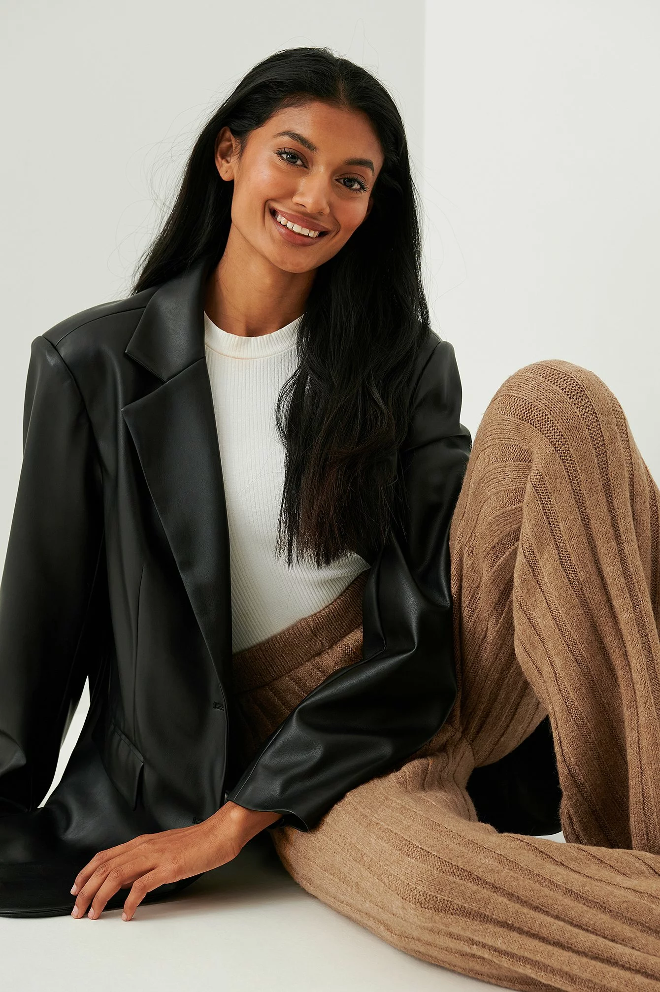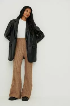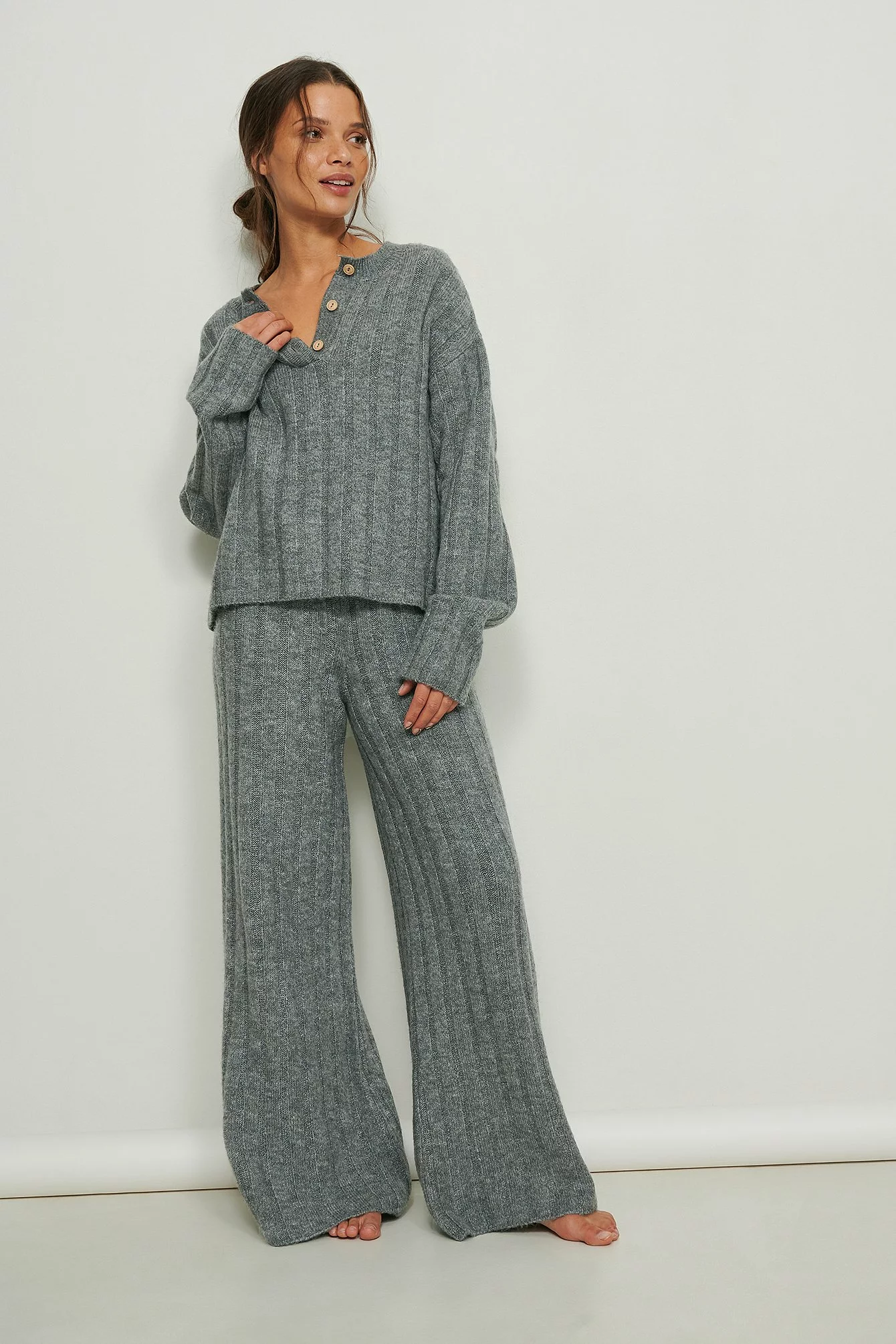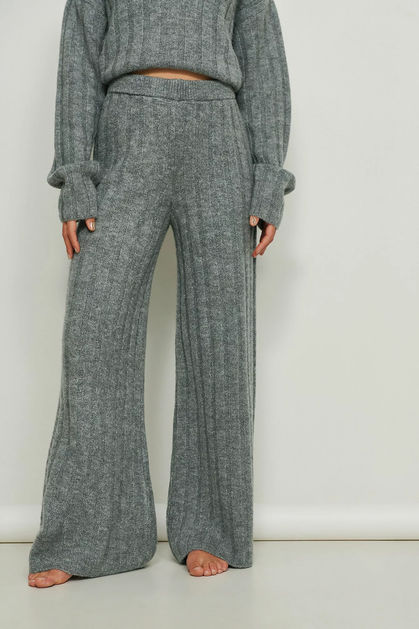 These wide leg pants are knitted and ribbed and feature a high waist and an elasticized waistband.
