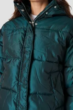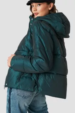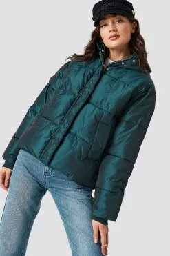 This Shiny padded jacket by NA-KD features a padded and warm material, puffy design, long sleeves, a hood, button details, two side pockets, a zipper and a button closure along the front.