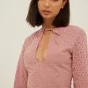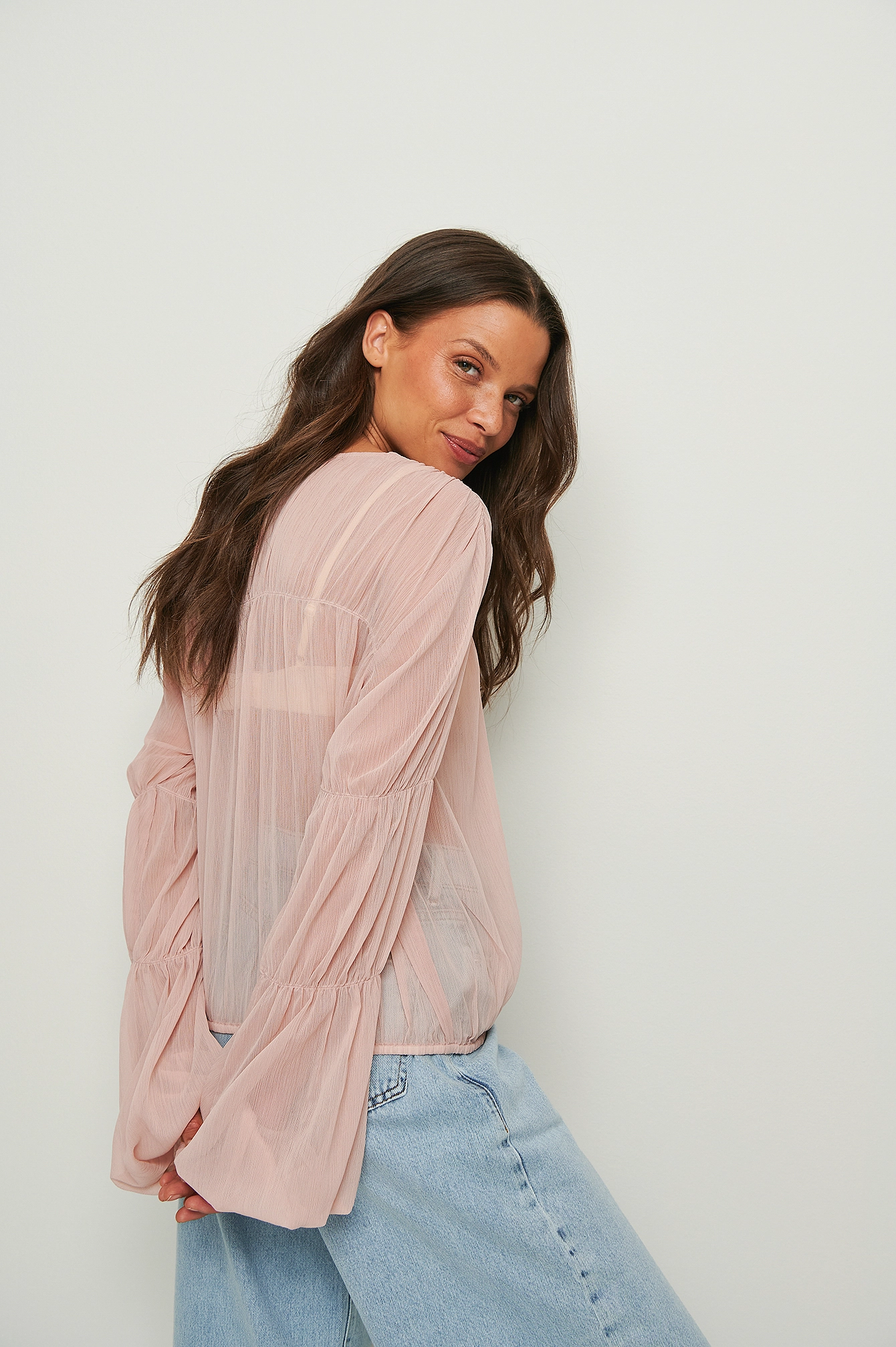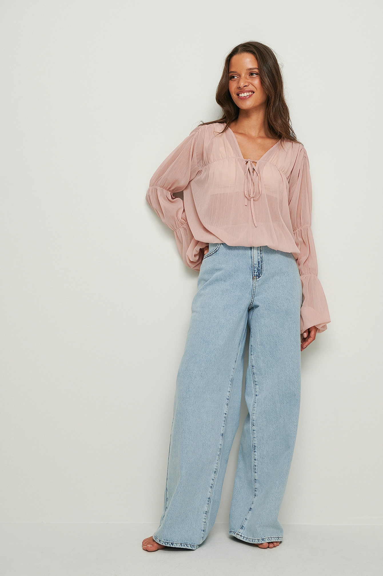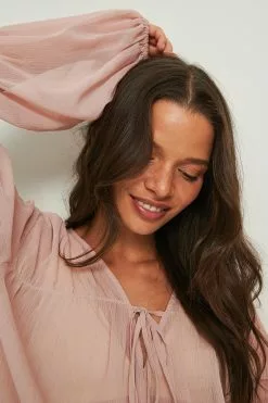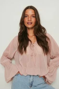 This blouse is sheer and seethrough and features a v neckline with a self-tie knot, long sleeves with seam details and balloon sleeves and an elasticized waist and cuff.