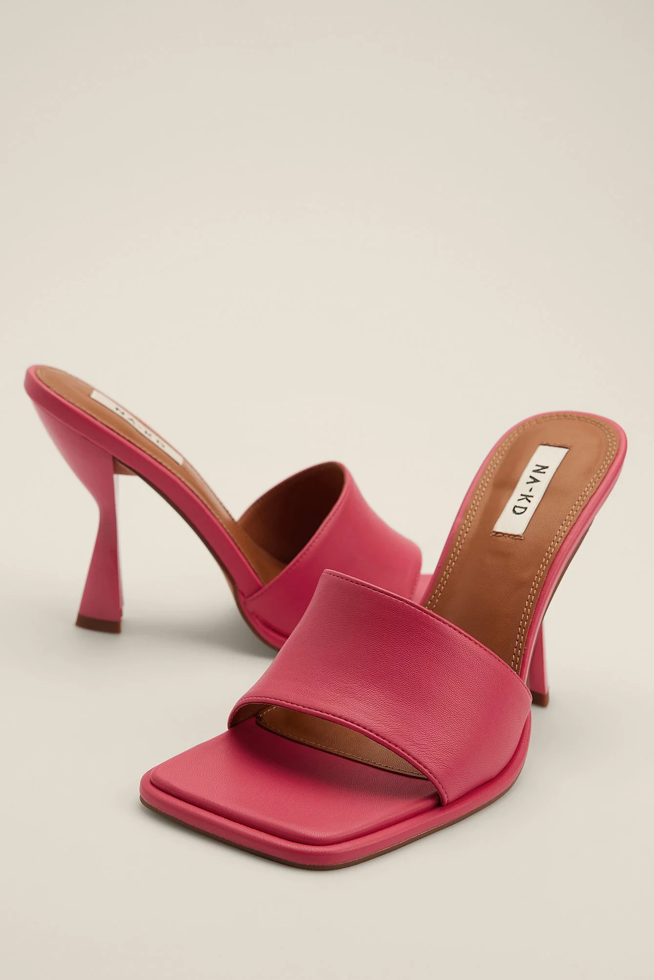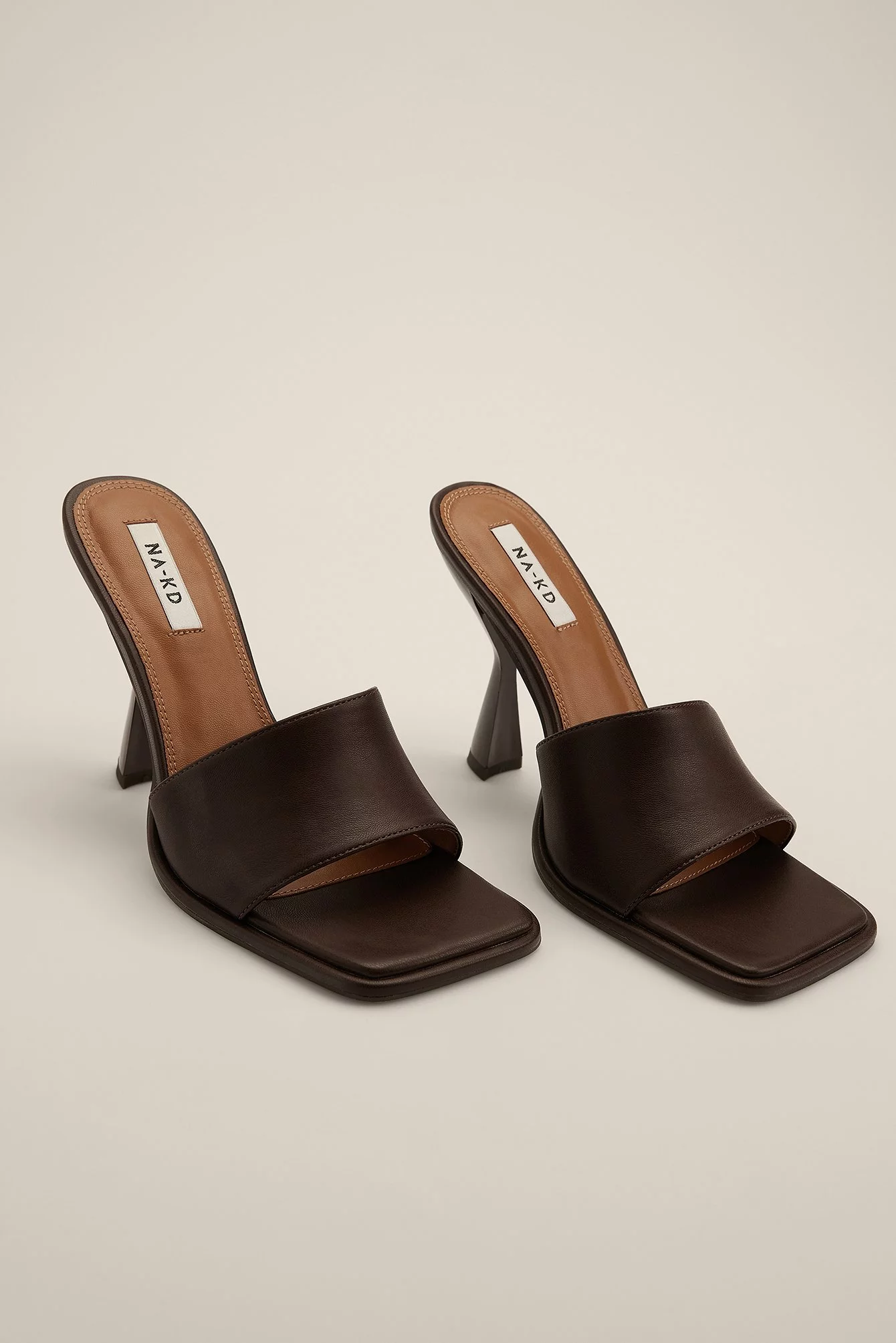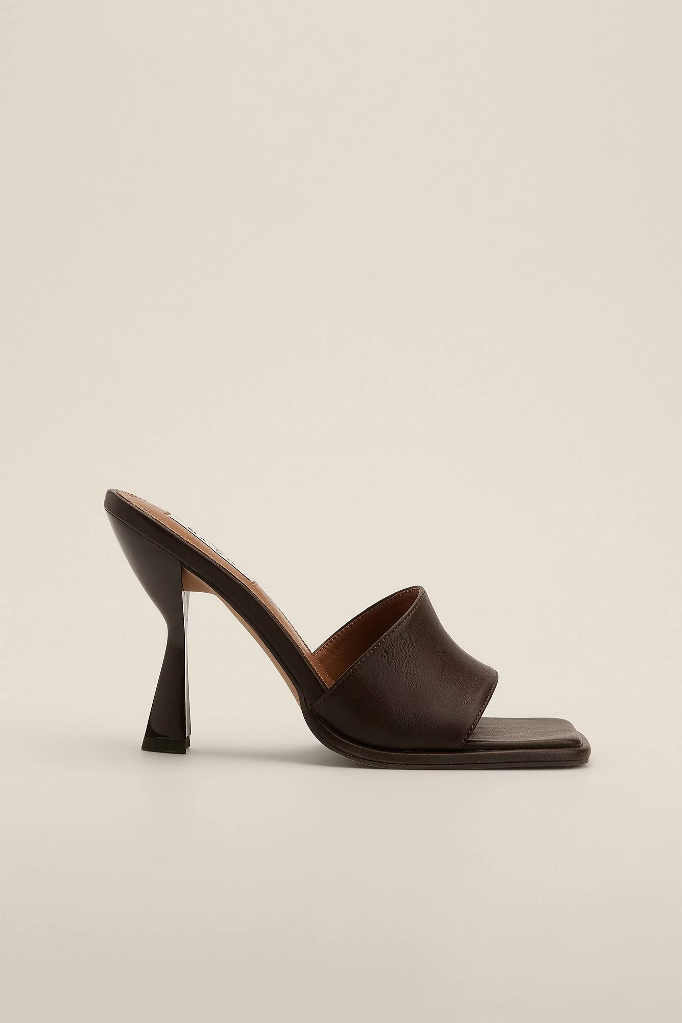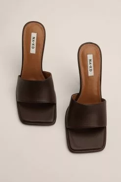 These mules feature a square toe, a wide front strap and an asymmetric heel. Measurements in size : Heel height: 10 cm / 4 in.