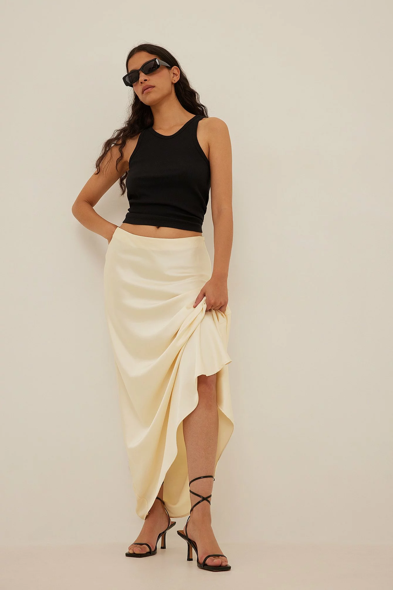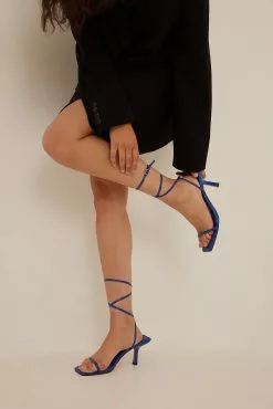 These sandals are high-heeled and feature straps on the ankle. Measurements in size 39: Heel height: 7 cm / 2.9 in. Insole length: 26 cm / 10.1 in.