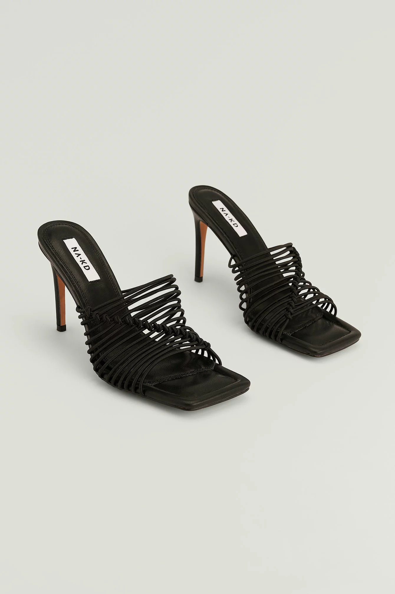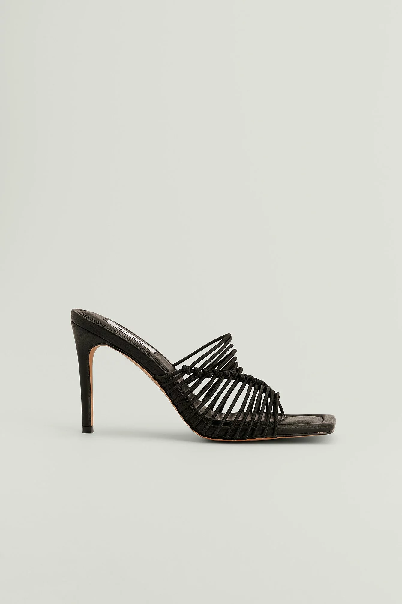 These heels feature a squared toe, thin heels, thin, elasticized strap details on the front and an inner sole with leather look. Heel Height: 10 cm / 3,9 in.