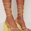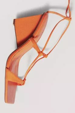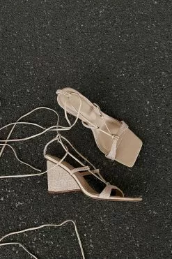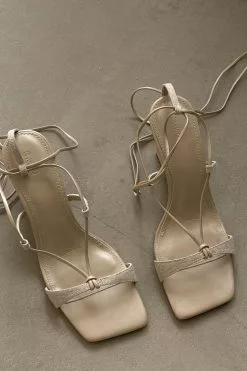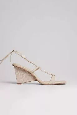 These heels feature a square toe. They have a wedge heel and an ankle-strap fastening with a self tie detail. Measurements in size 39: Heel height: 7,5 cm / 2.9 in.