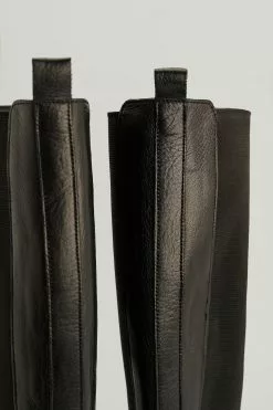 These boots are knee high and feature elasticized shafts, a rounded toe and a chunky sole. Big in size. Sole Height: 4,8 cm / 2 in. The shaft height on this boot measures 43,7 cm / 17.2 in in size 39. The shaft height might differ from size to size.