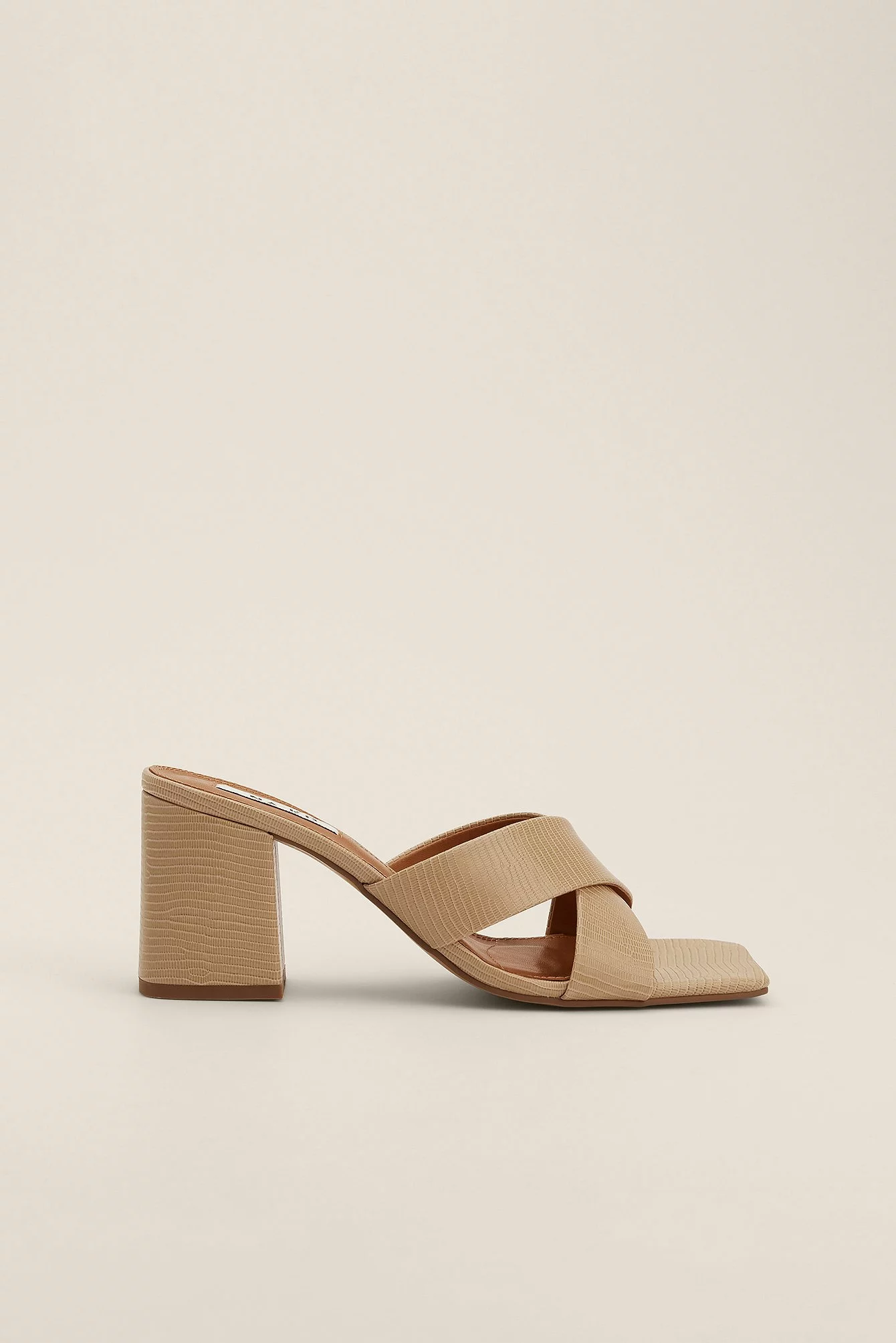 These mules are high-heeled and crossed and feature a snake look. Measurements in size 39: Heel height: 7 cm / 2.9 in. Insole length: 26 cm / 10.1 in.