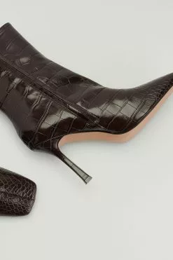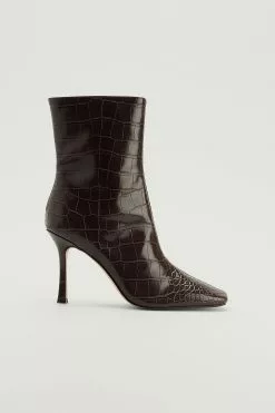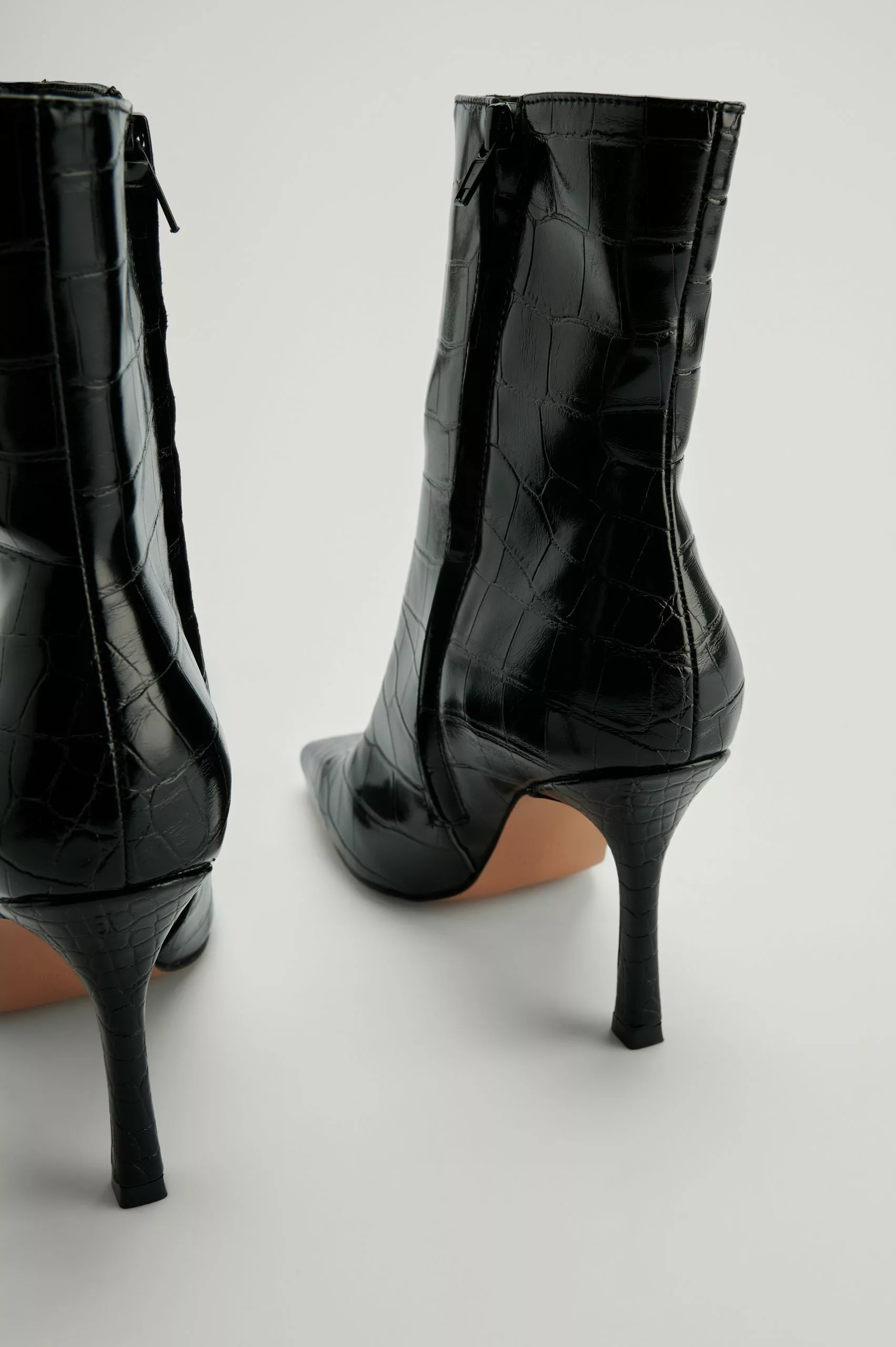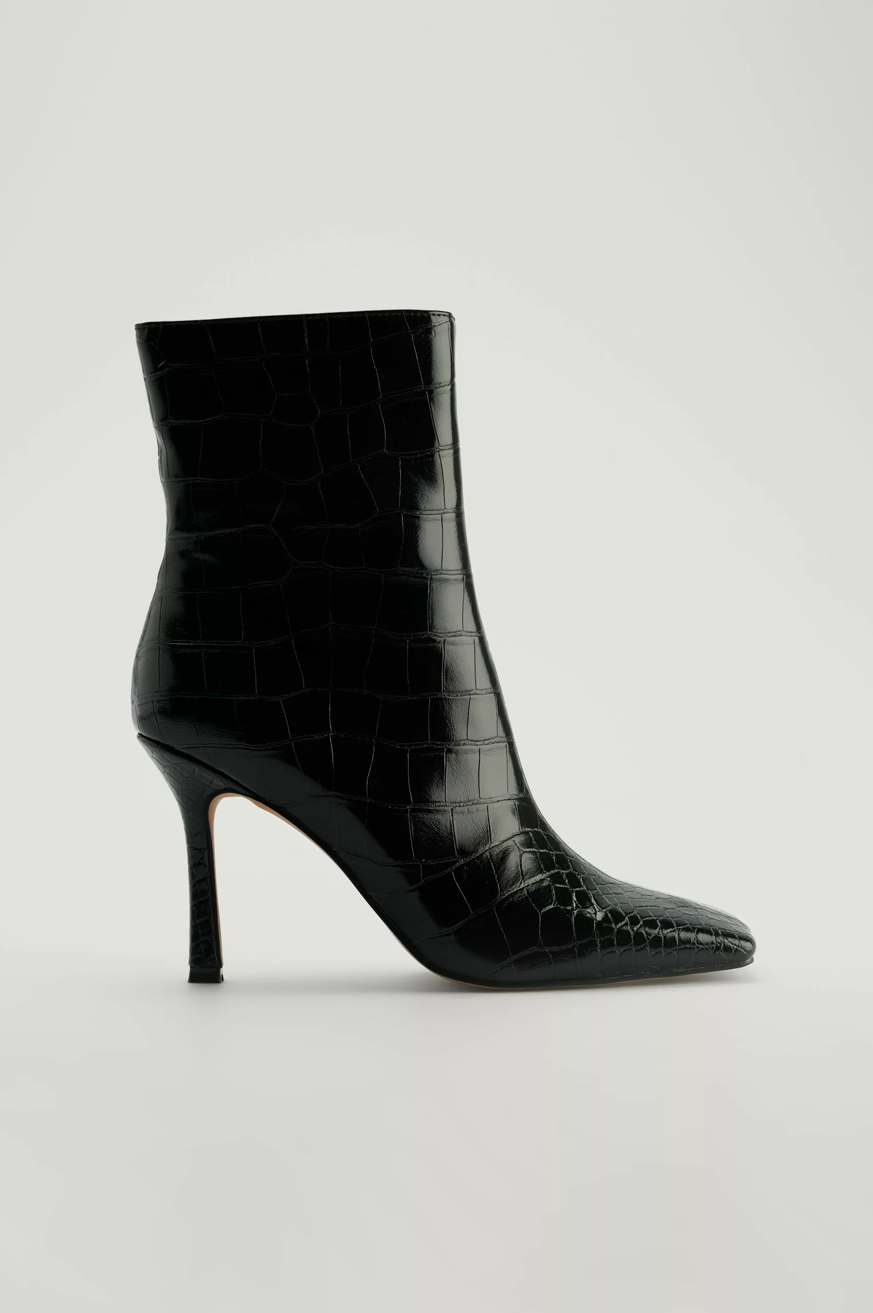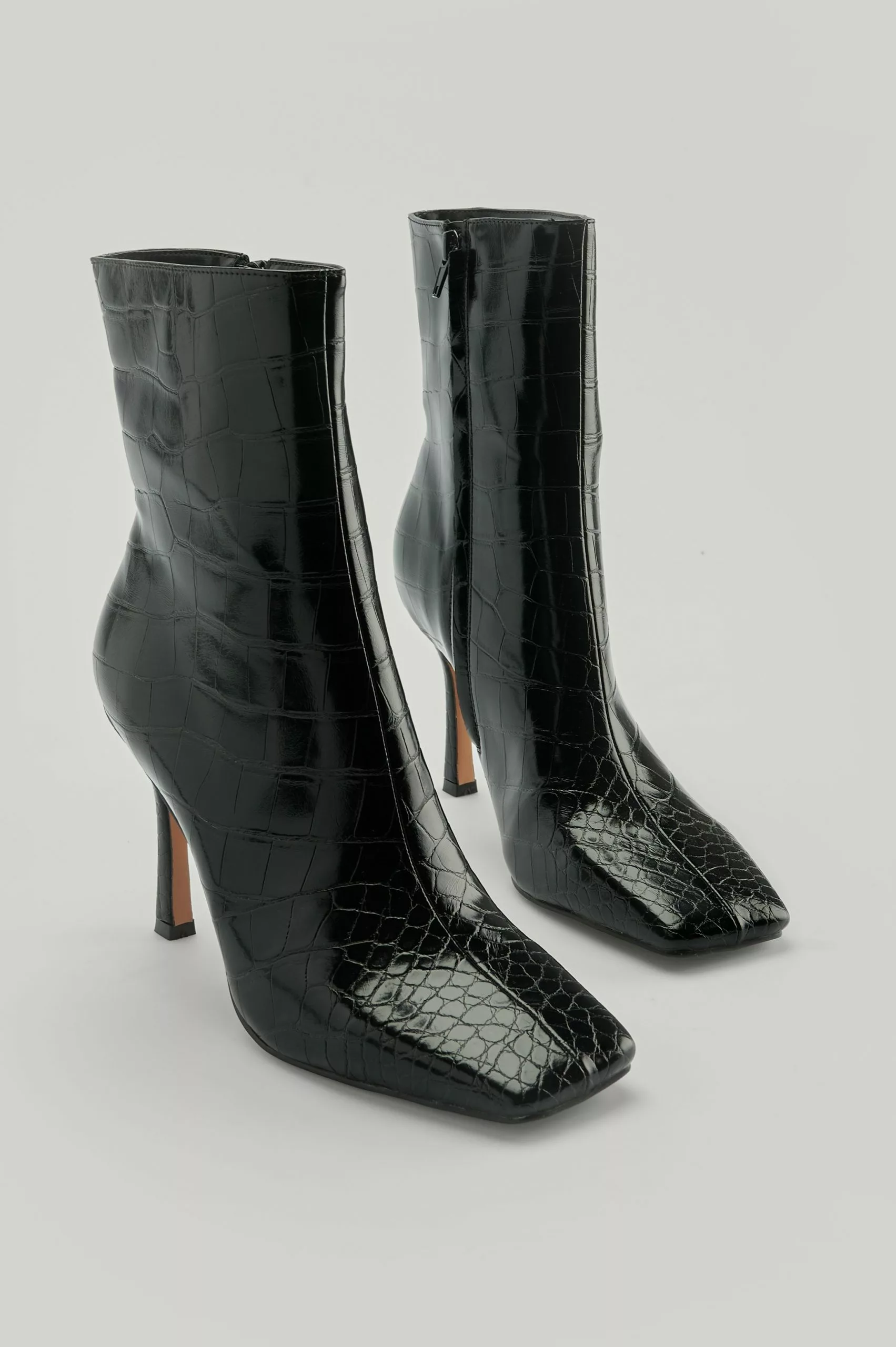 These boots are calf high and made of PU and feature a stiletto heel. They have a reptile pattern and a side zipper. These boots feature a squared toe. Measurements in size EU 39: Heel height: 9 cm / 3.54 in. Shaft height: 17 cm / 6.69 in. Shaft circumference around the calf: 30 cm / 11.81 in.