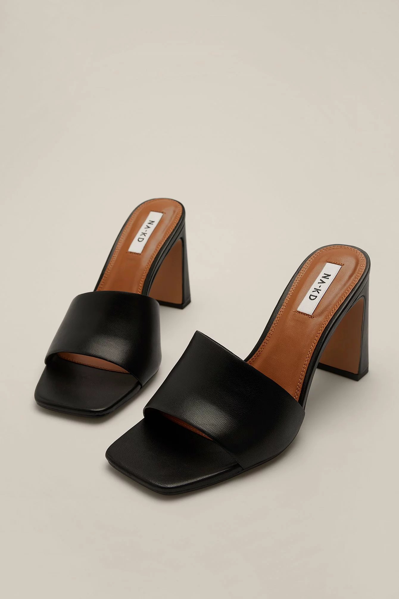 These heels feature squared, open toes, a wide strap and a flared high heel. Measurements in size 39: Sole height: 0,7 cm / 0.4 in. Heel height: 9,5 cm / 3.11 in. Insole length: 24,5 cm / 9.11 in.