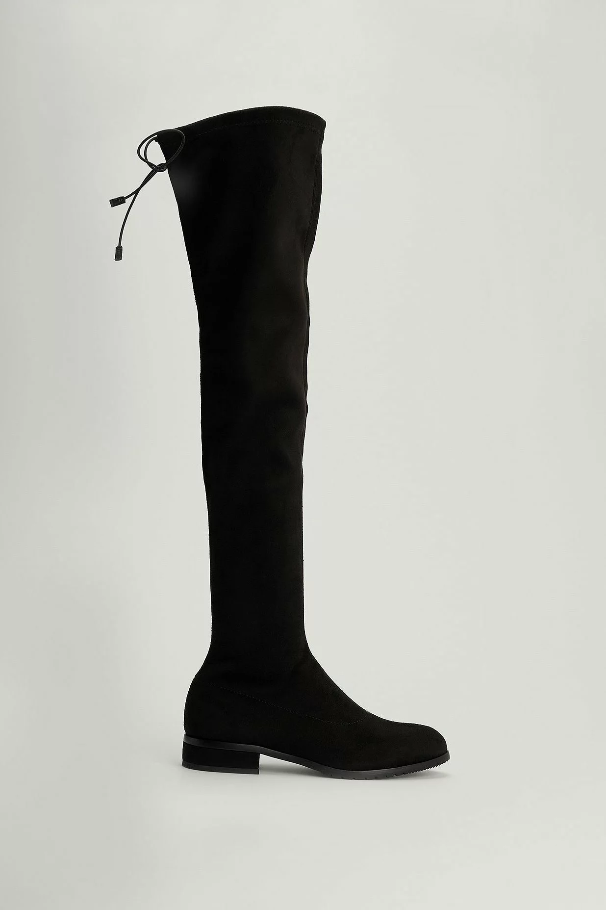 This boot features a thigh high design, a rounded toe, a side zipper on the inside and an adjustable drawstring at the top. Heel Height: 2,4 cm / 0.9 in.