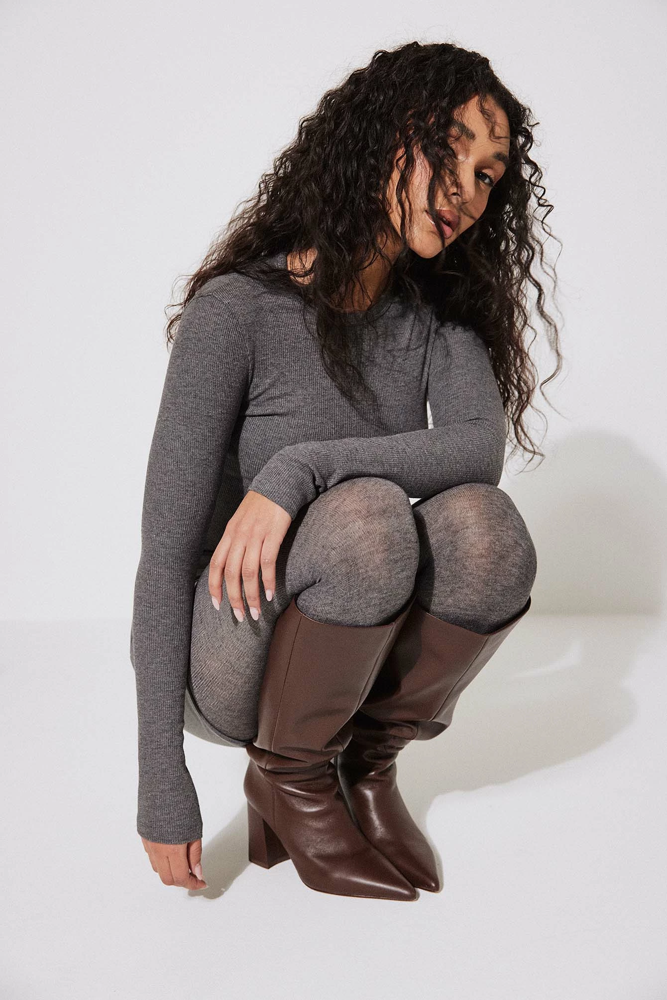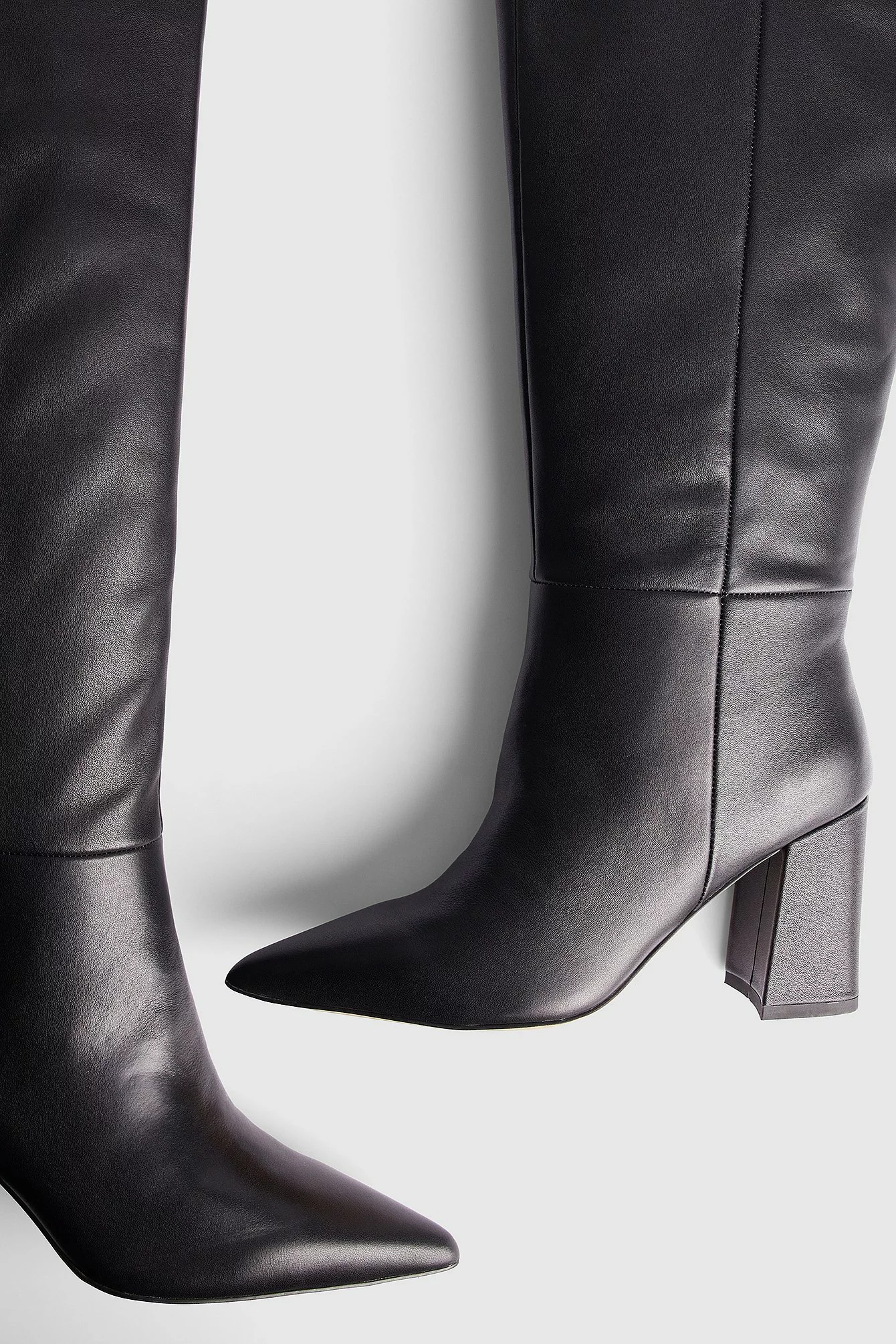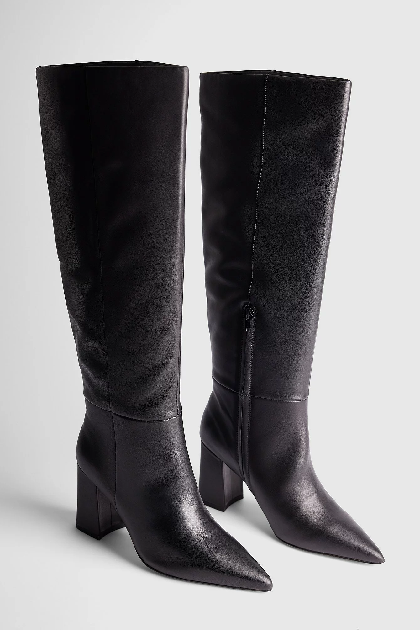 These boots are knee high and pointed and feature a high block heel. They have a side zipper closure. Measurements in size 39: Heel height: 8,5 cm / 3.3 in. Shaft height: 44 cm / 17.2 in. Shaft circumference around the calf: 41 cm / 16 in.