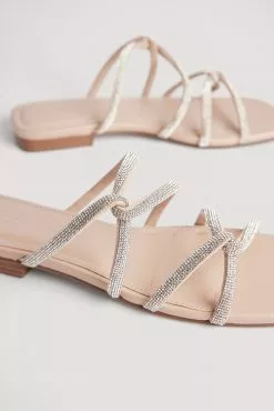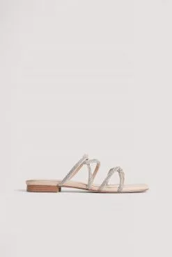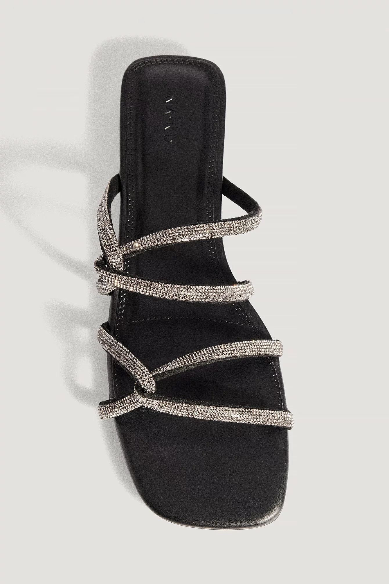 This flat features a strappy sandal. They have a slip-on design and a thin sole. This flat features a square toe, a rhinestone embellishment on the straps and a slim fit. Measurements in size 39: Heel height: 2 cm / 0.78 in. Insole length: 25,5 cm / 10.03 in.