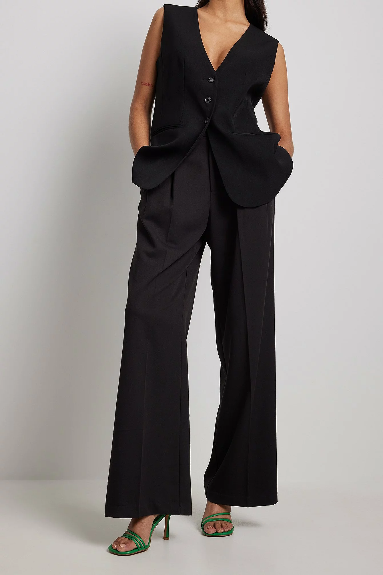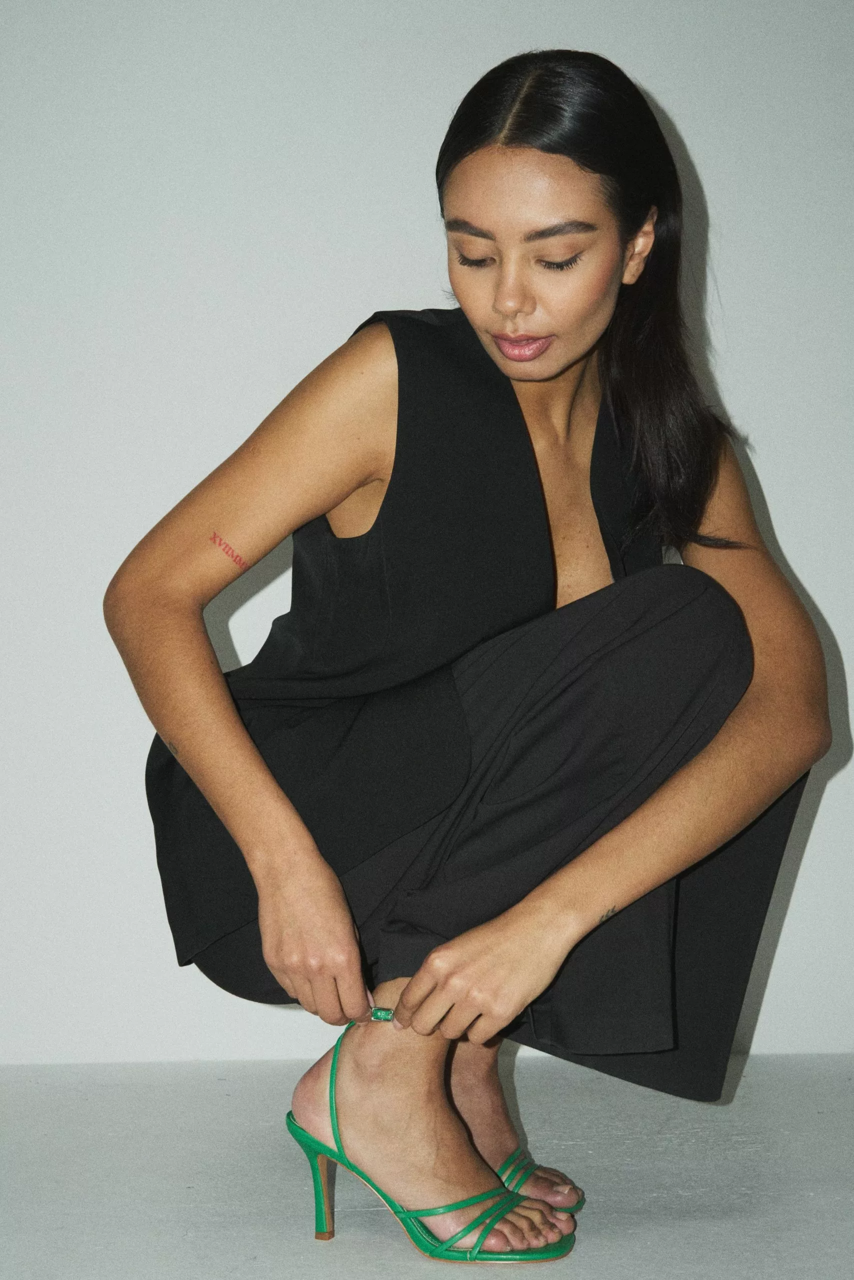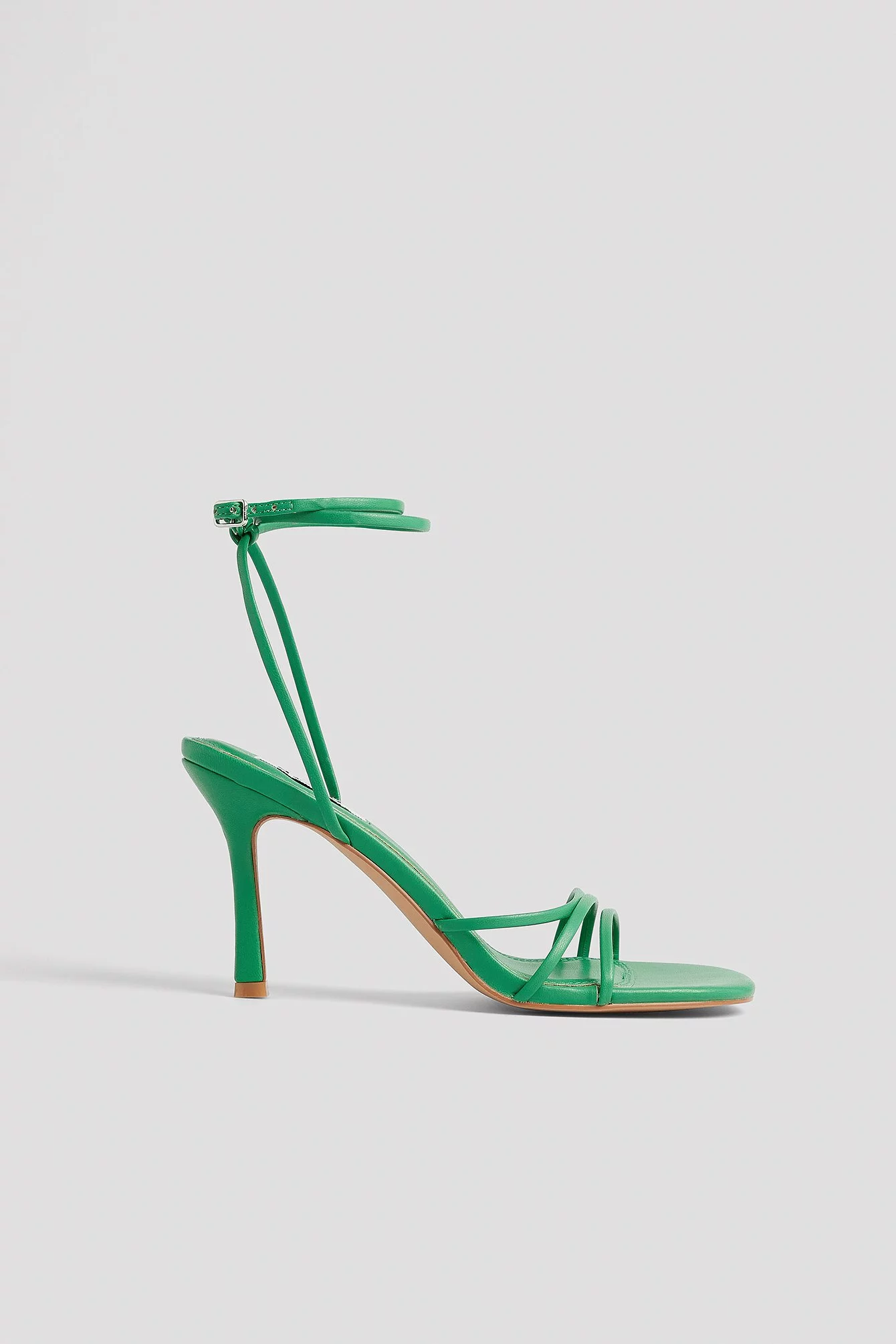 This strappy sandal features a rounded toe. It has a buckle closure. Heel Height: 10 cm / 3.93 in.