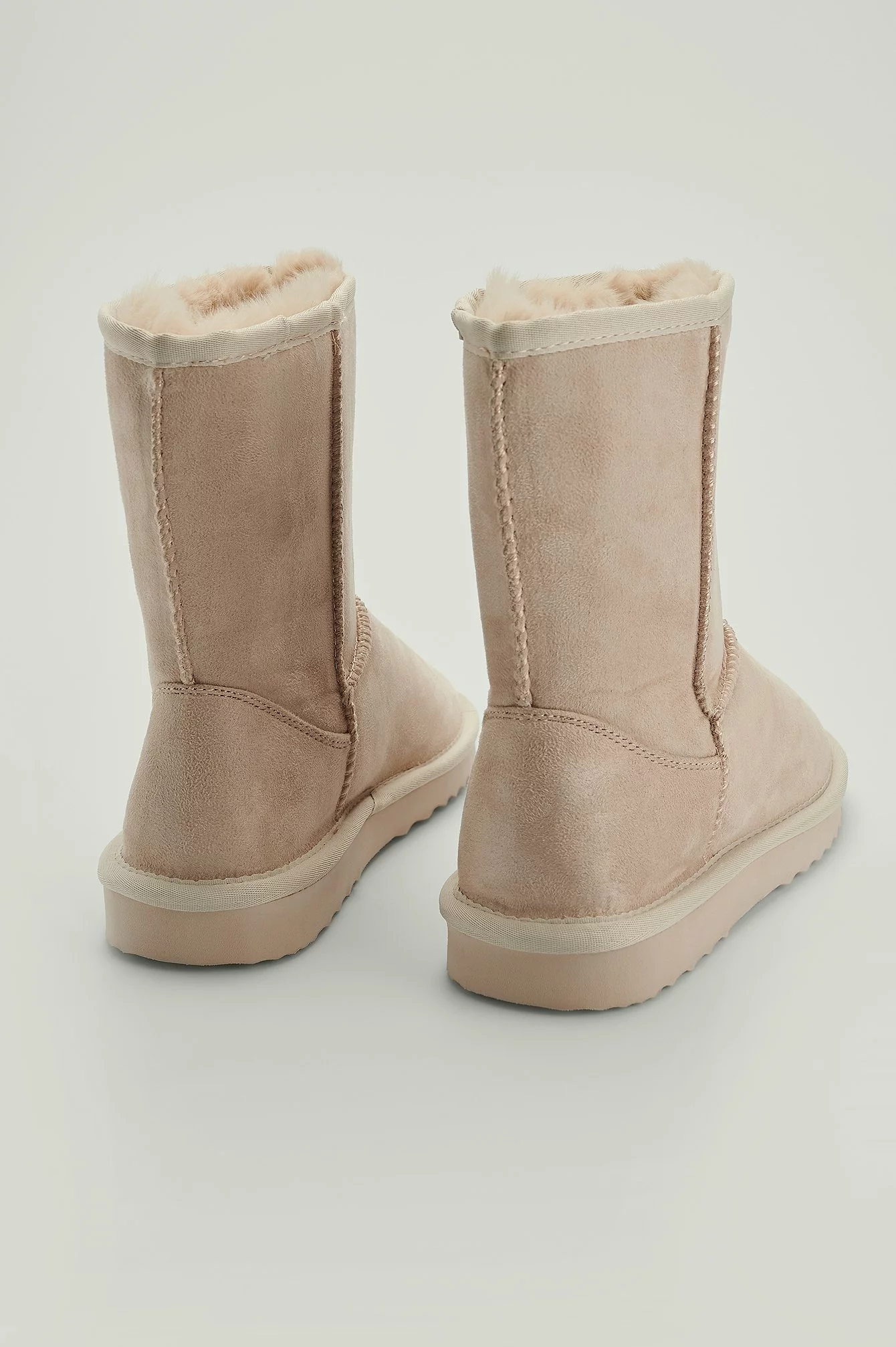 These boots feature a rounded toe and a warm, soft material with a rubber sole.