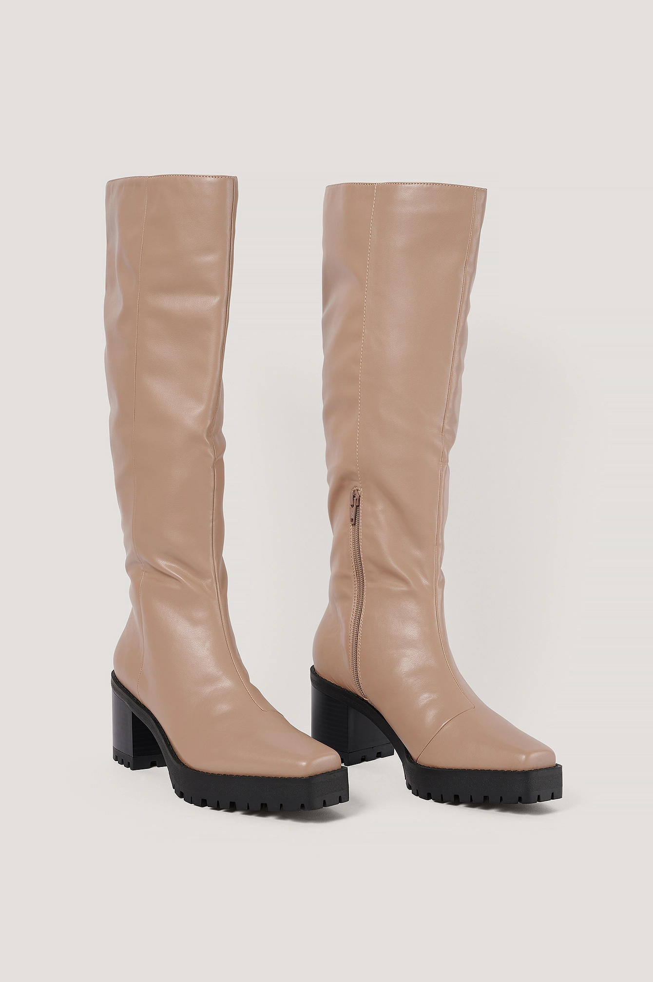 These boots are knee high and feature a side zipper closure, a squared sole with a square toe, chunky, square high heels and seam details on the front and on each side. Heel Height: 7 cm / 2.75.