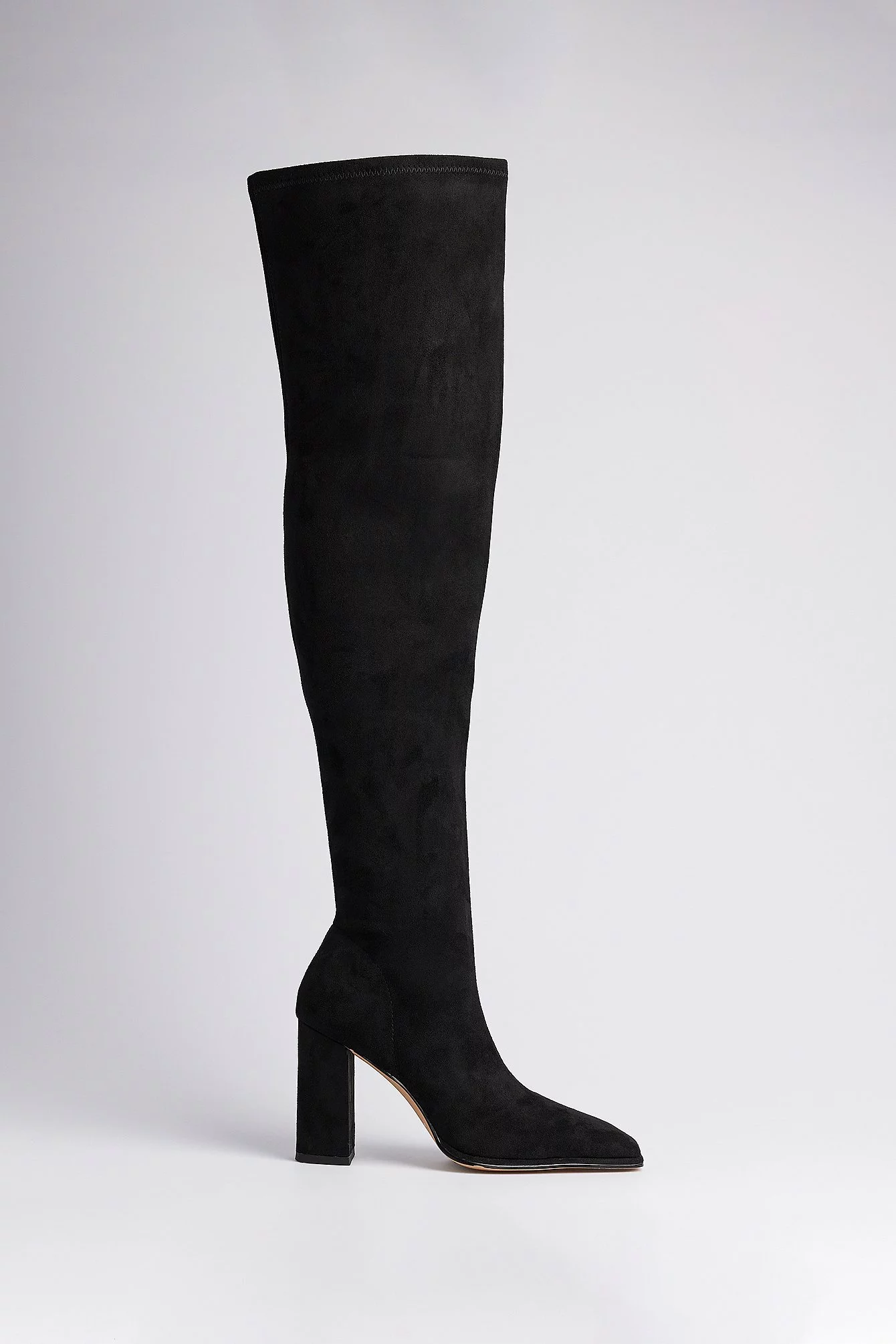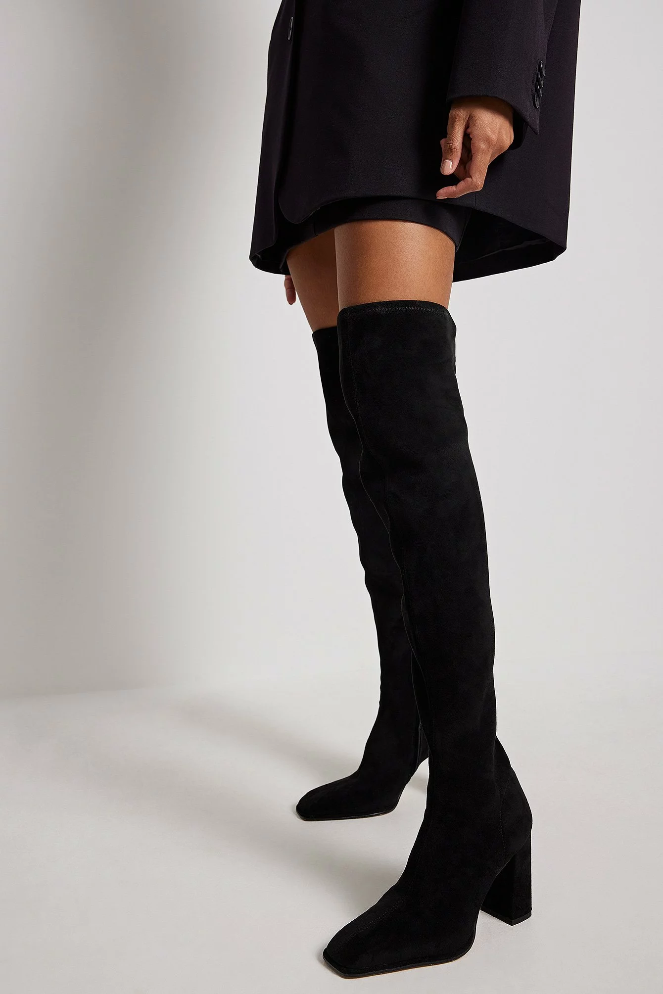 These boots feature an over knee length, a square toe and a block heel. Heel Height: 10 cm / 3.9 in.