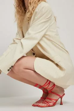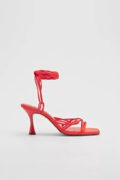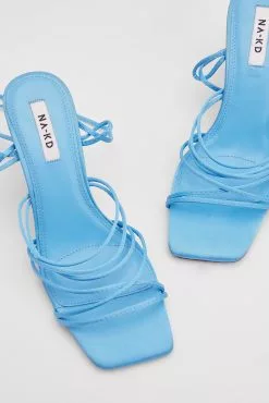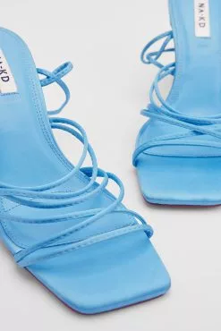 These sandals feature a squared toe, thin, crossed straps on the front, an asymmetric heel and a self-tie band on the ankle. Measurements in size : Heel height: 8,3 cm / 3.25 in.