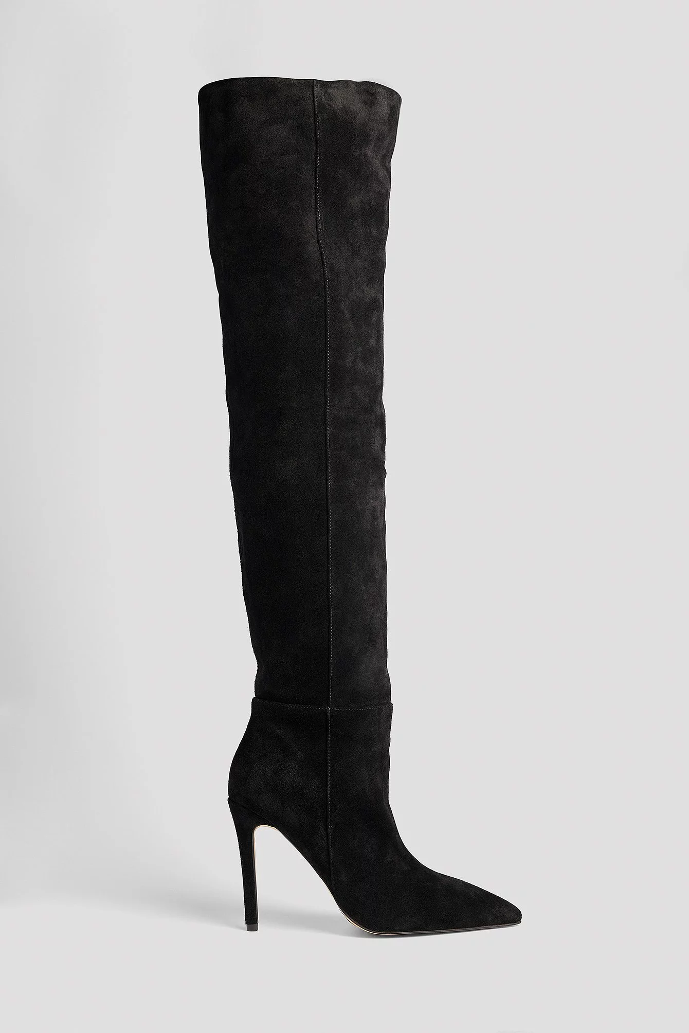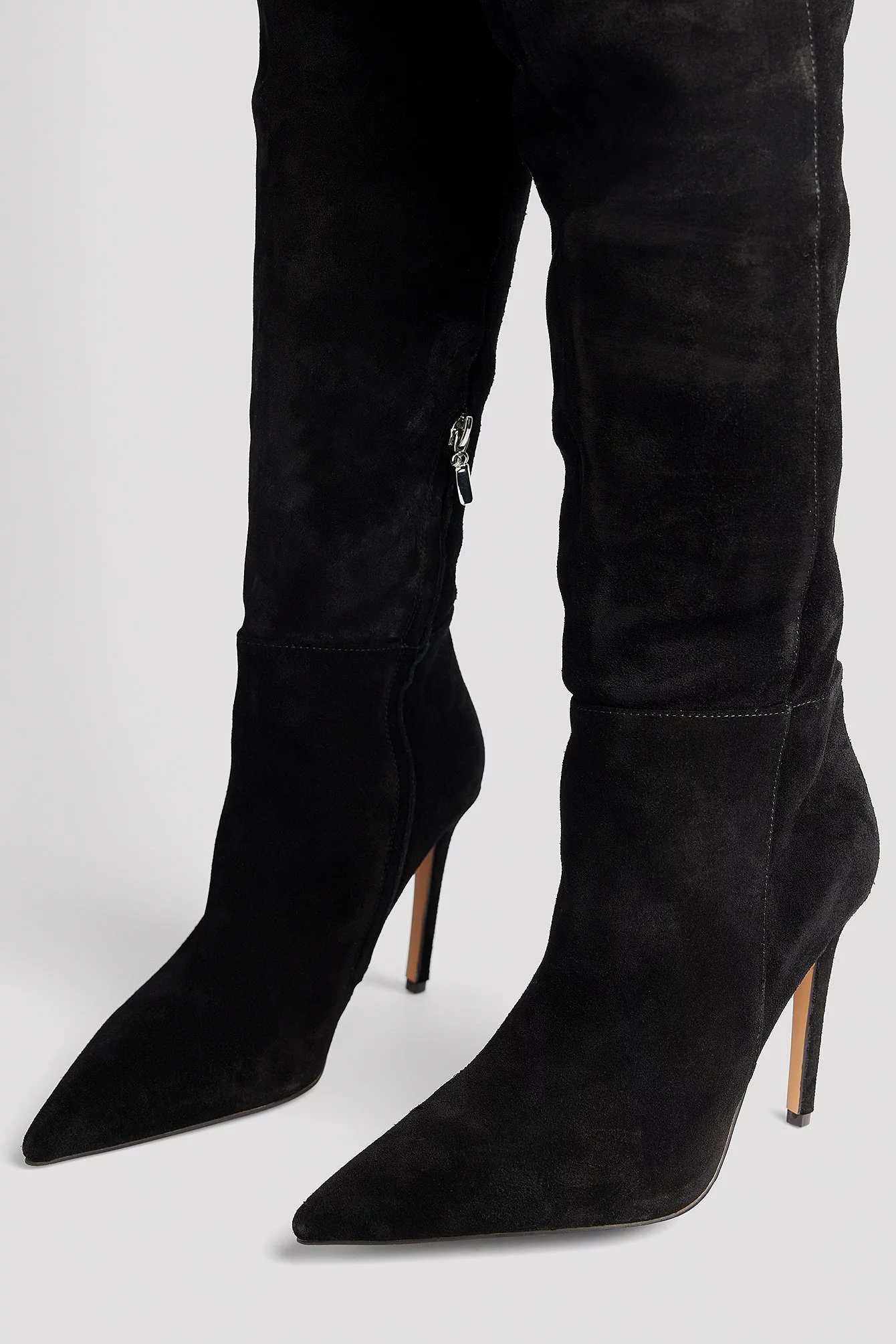 These boots are made of suede and feature an over knee length, stiletto heels and a side zipper closure at the bottom half. The color of this product may transfer to itself or other objects. Avoid making contact with light-colored surfaces. Measurements in size 39: Heel height: 10,5 cm / 4.1 in. Shaft height: 62 cm / 24.4 in. Shaft circumference around the calf: 36 cm / 14.17 cm.