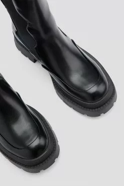 These boots feature a rounded toe, a chunky rubber sole and a calf high shaft with elastic, wavy details. Measurements in size : Sole height: 2,5 cm / 1 in. Shaft height: 23 cm / 9 in. Shaft circumference around the calf: 28,5 cm / 11.2 in.