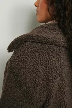This jacket features a teddy material, a snap button closure, a collar, open pockets and a lining.